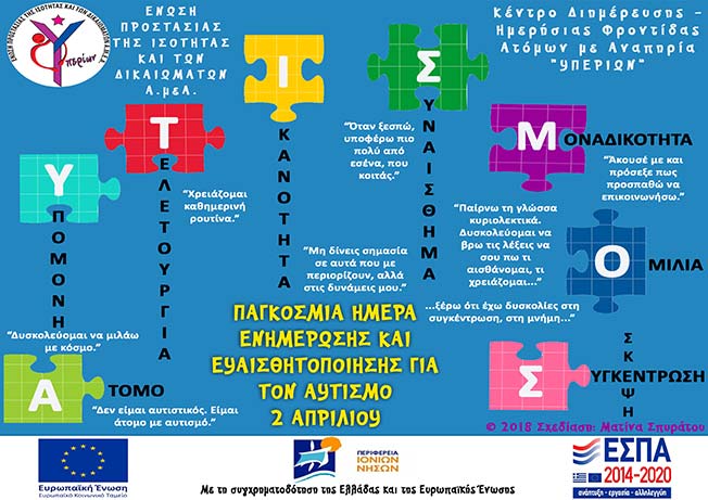 Φέτος είναι η πρώτη χρονιά, που γιορτάζει το Κέντρο Διημέρευσης – Ημερήσιας Φροντίδας (Κ.Δ.Η.Φ.) Ατόμων με Αναπηρία «ΥΠΕΡΙΩΝ» της Ένωσης Προστασίας της Ισότητας και των Δικαιωμάτων Ατόμων με Αναπηρία «ΥΠΕΡΙΩΝ», ανοιχτό σε όλο τον κόσμο για ενημέρωση και ευαισθητοποίηση, σχετικά με αυτήν την ισόβια αναπτυξιακή διαταραχή, αλλά και άλλες. Για αυτό το λόγο, με την υποστήριξη και τη σύμφωνη γνώμη του Διοικητικού Συμβουλίου της Ένωσης θα παρευρεθούν ωφελούμενοι του Κέντρου και επιστημονικό – εκπαιδευτικό προσωπικό του, τη Μεγάλη Δευτέρα, 2 Απριλίου 2018, στις 11:00 το πρωί στην Κεντρική Πλατεία Ληξουρίου πραγματοποιώντας μία συμβολική δράση.