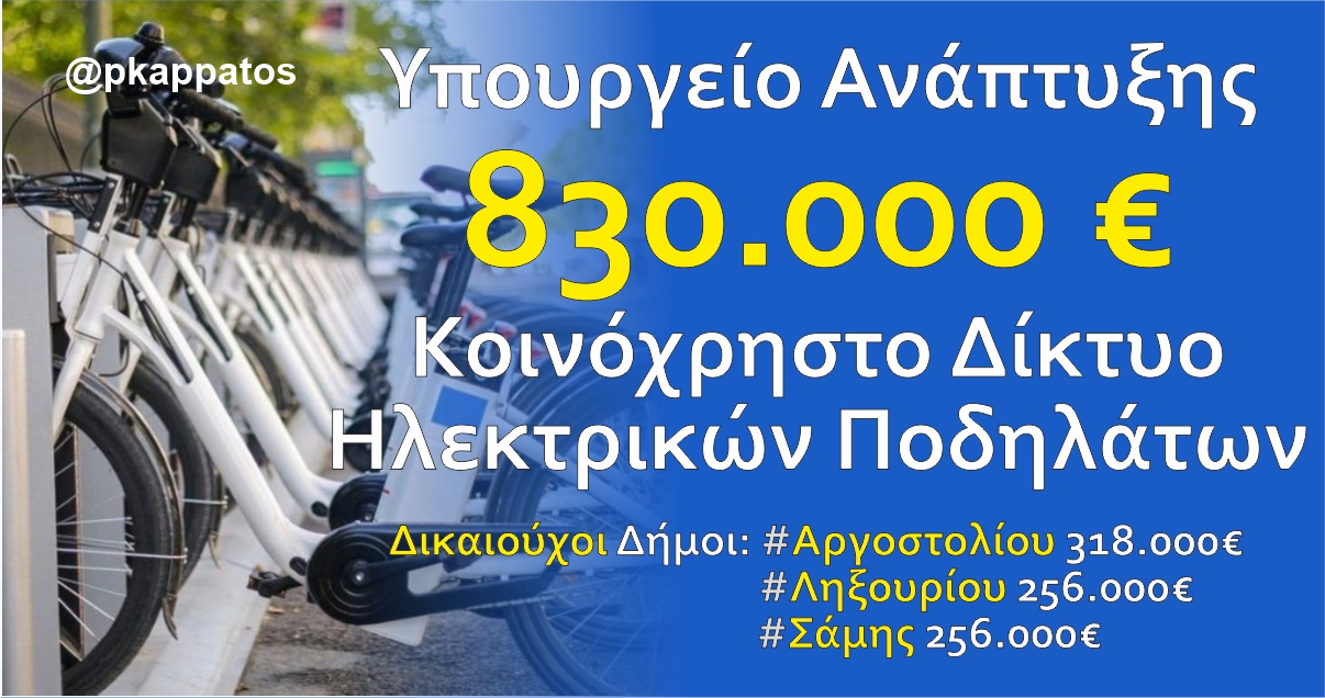 Η Κεφαλονιά με συνολική χρηματοδότηση 830.000 ευρώ μπαίνει και αυτή στην εποχή των κοινόχρηστων μέσων ηλεκτροκίνησης. Μέσω του Υπουργείου Ανάπτυξης και Επενδύσεων (συγχρηματοδότηση ΕΣΠΑ 2014-2020 / Ταμείο Συνοχής), στο πλαίσιο της πράξης «Βιώσιμη μικροκινητικότητα μέσω συστήματος κοινόχρηστων ποδηλάτων», χρηματοδοτούνται οι δήμοι: