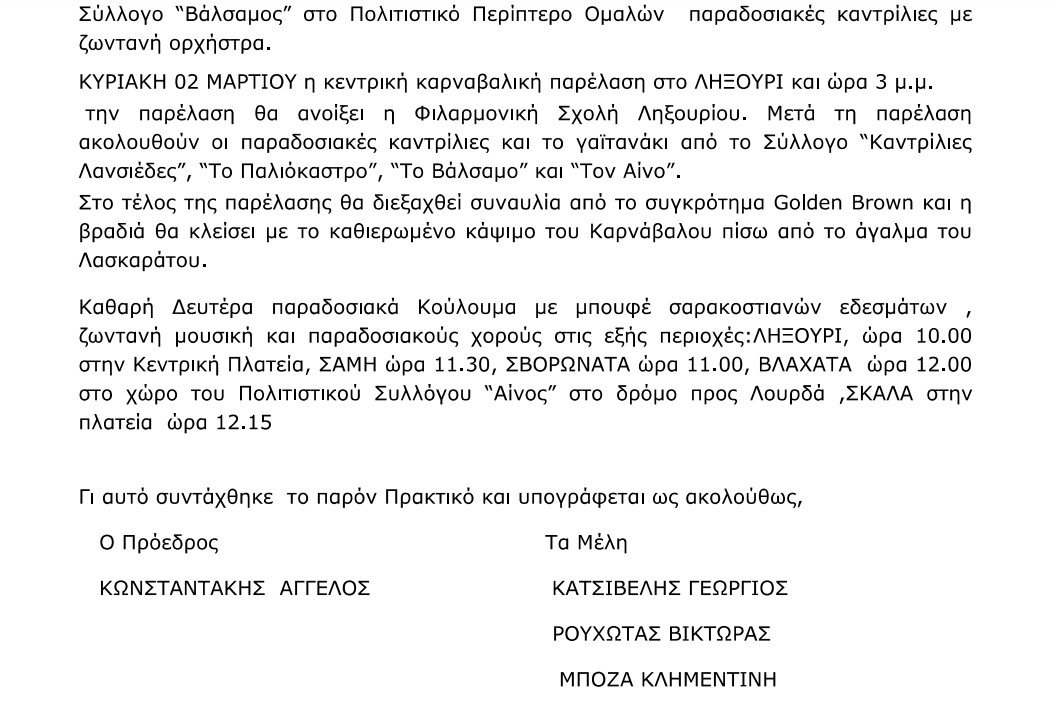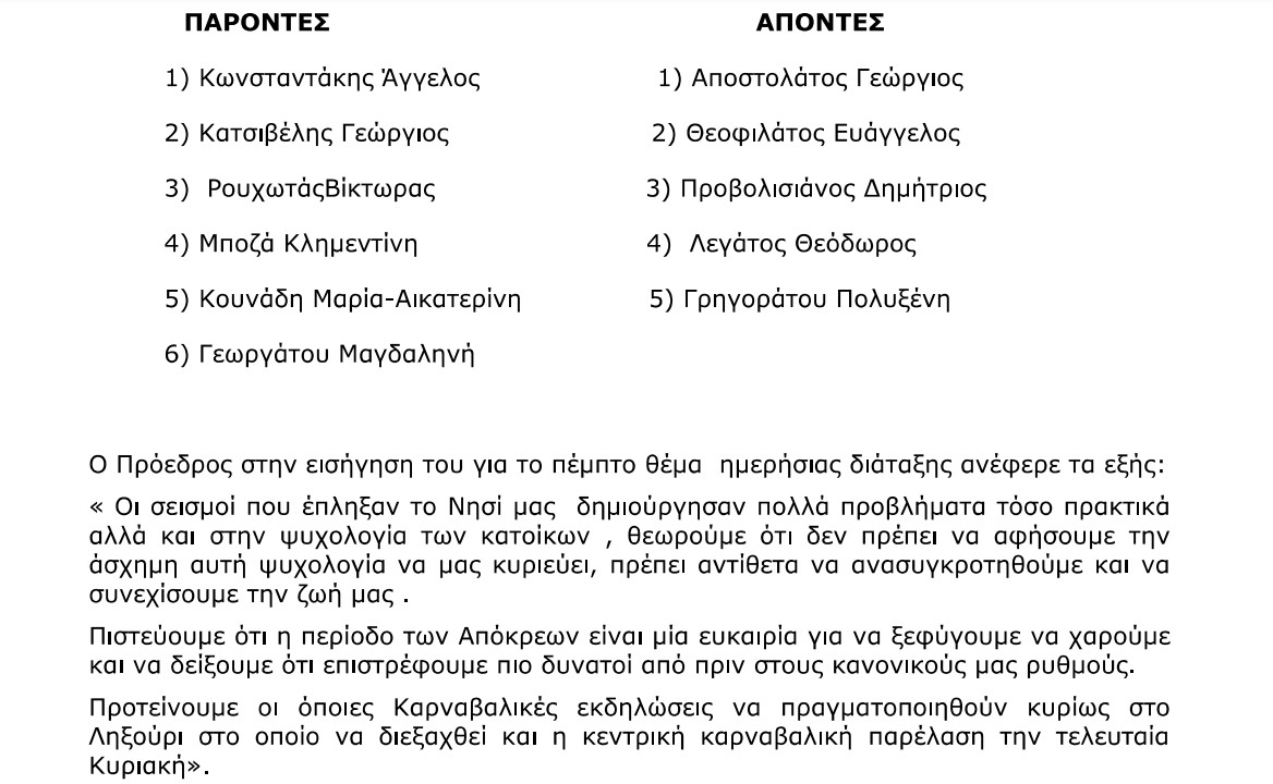 «Οι σεισμοί που έπληξαν το Νησί μας δημιούργησαν πολλά προβλήματα, τόσο πρακτικά αλλά και στην ψυχολογία των κατοίκων, θεωρούμε ότι δεν πρέπει να αφήσουμε την άσχημη αυτή ψυχολογία να μας κυριεύει, πρέπει αντίθετα να ανασυγκροτηθούμε και να συνεχίσουμε την ζωή μας. Πιστεύουμε ότι η περίοδος των Απόκρεων είναι μία ευκαιρία για να ξεφύγουμε να χαρούμε και να δείξουμε ότι επιστρέφουμε πιο δυνατοί από πριν στους κανονικούς μας ρυθμούς».