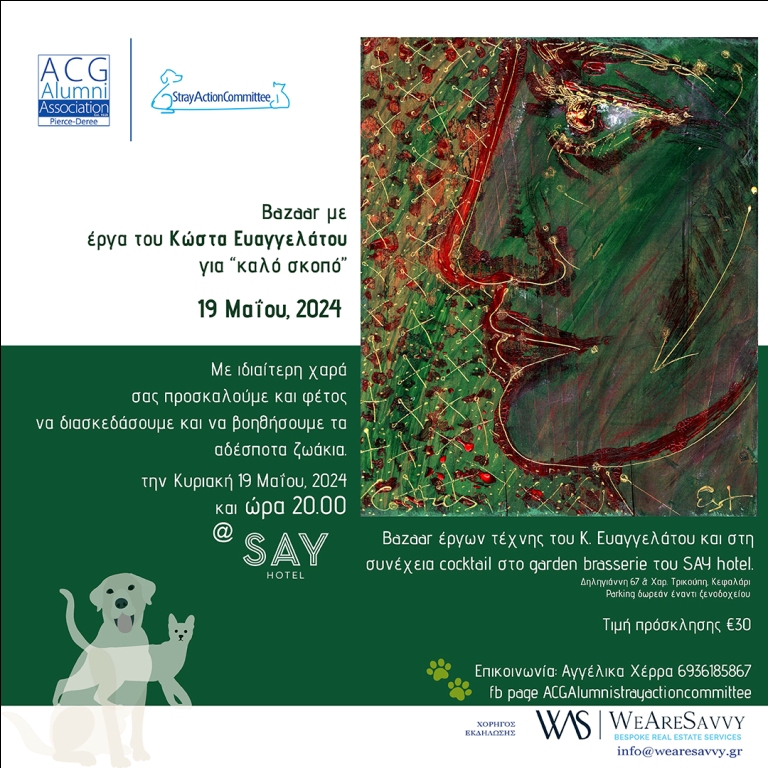 Επίσης την Κυριακή 19 Μαίου 2024, 8 μ.μ. θα γίνει αποκλειστικά με ζωγραφικά και γλυπτικά έργα του bazaar για τα αδέσποτα ζώα στο SAY ΗOTEL, Δεληγιάννη 67 στο Κεφαλάρι της Κηφισιάς, που διοργανώνει η ASG ALUMNI ASSOCIATION, Σύλλογος Αποφοίτων PIERCE-DEREE COLLEGE.
