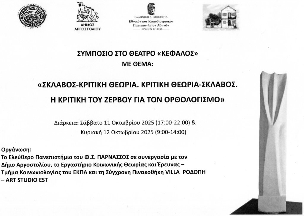 Στη συνέχεια το Σάββατο 11 Οκτωβρίου το απόγευμα θα λάβει μέρος με ομιλία του θεωρητικού θέματος: “Οι αμορφικοί προσανατολισμοί της δεκαετίας του 1960 στην Νέα Υόρκη και το Παρίσι” στο Συμπόσιο για τον κορυφαίο γλύπτη Γεράσιμο Σκλάβο, στο Δημοτικό Θέατρο “Ο ΚΕΦΑΛΟΣ” στο Αργοστόλι. Το συμπόσιο έχει τίτλο: ” ΣΚΛΑΒΟΣ -ΚΡΙΤΙΚΗ ΘΕΩΡΙΑ. ΚΡΙΤΙΚΗ ΘΕΩΡΙΑ-ΣΚΛΑΒΟΣ. Η ΚΡΙΤΙΚΗ ΤΟΥ ΖΕΒΟΥ ΓΙΑ ΤΟΝ ΟΡΘΟΛΟΓΙΣΜΟ” και διοργανώνεται από το Ελεύθερο Πανεπιστήμιο του Φιλολογικού Συλλόγου “Παρνασσός” σε συνεργασία με τον Δήμο Αργοστολίου, το Εργαστήριο Κοινωνικής θεωρίας και Έρευνας – Τμήμα Κοινωνιολογίας του ΕΚΠΑ και την Σύγχρονή Πινακοθήκη Villa “Ροδόπη”- Art Studio EST.