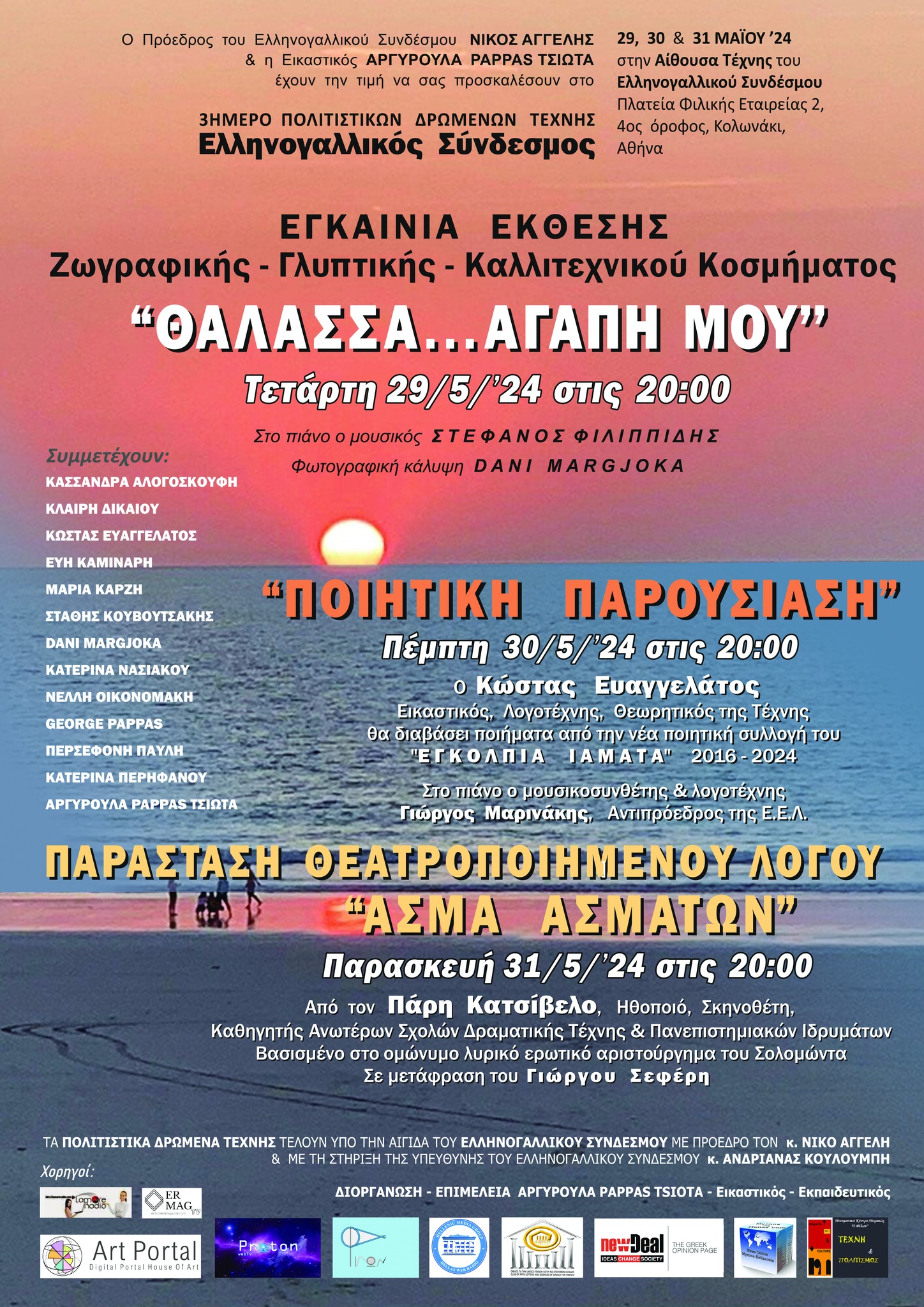 Στα πλαίσια του 3ήμερου Πολιτιστικών Δρώμενων Τέχνης που θα παραγματοποιηθεί στην Αίθουσα του Ελληνογαλικού Συνδέσμου, με την διοργάνωση – επιμέλεια της εικαστικού-εκπαιδευτικού Αργυρούλας Pappas- Τσιώτα, θα γίνει την Πέμπτη 30 Μαίου, ώρα 8 μ.μ. ποιητική παρουσίαση του εικαστικού, λογοτέχνη, θεωρητικού της τέχνης Κώστα Ευαγγελάτου.