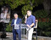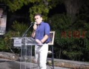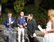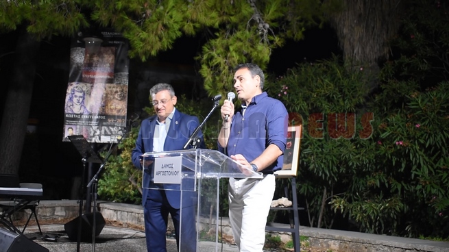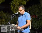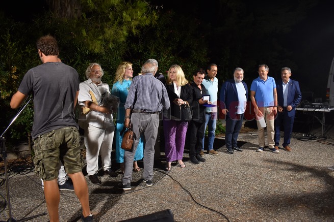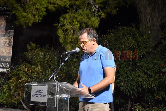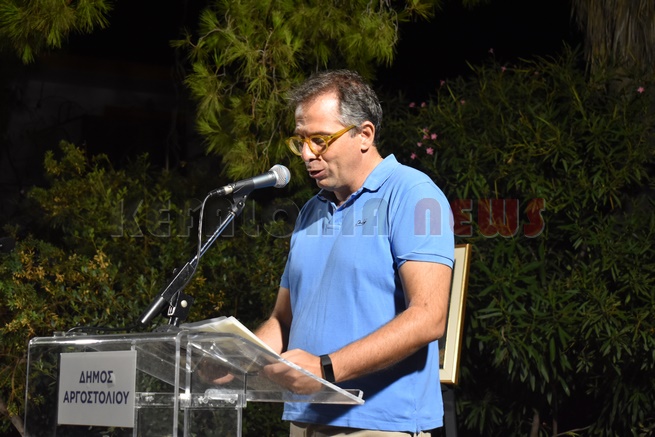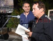 Στη συνέχεια χαιρέτισε ο ίδιος ο καλλιτέχνης και αναγνώστηκε από τον ίδιο, το ποίημα του «Εγκάρσια πτήση». Ακολούθησε Ομιλία του Δρ. Ιστορίας στο Ιόνιο Πανεπιστήμιο, εκπαιδευτικού και συγγραφέα κ. Ηλία Τουμασάτου με τίτλο: «Πενήντα χρόνια δημιουργικής νεότητας».