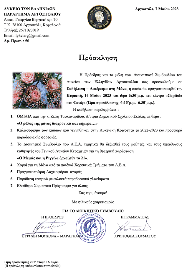 Λύκειο Ελληνίδων: Εκδήλωση – αφιέρωμα στη Μάνα…