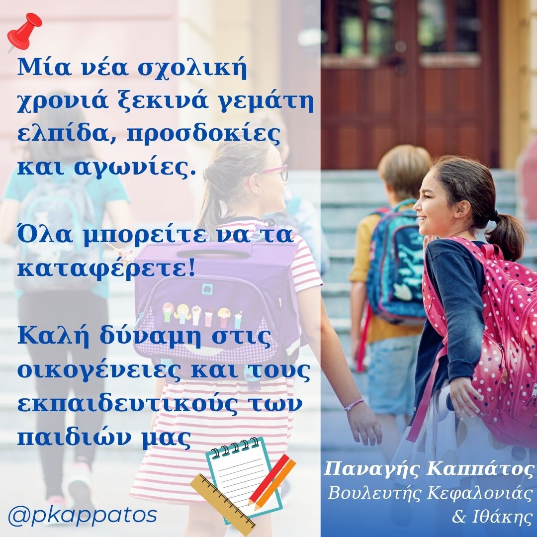Με αφορμή την έναρξη της νέας σχολικής περιόδου, εκφράζω τις θερμότερες ευχές μου στις μαθήτριες και στους μαθητές, στις οικογένειές τους, καθώς και στους εκπαιδευτικούς, για μια καλή και γόνιμη χρονιά.