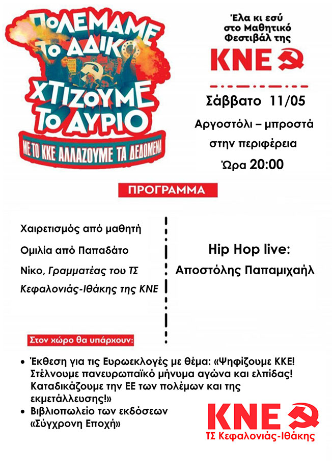 Το Σάββατο 11 Μάη θα πραγματοποιηθεί το μαθητικό φεστιβάλ της Τομεακής Οργάνωσης Κεφαλονιάς της ΚΝΕ με σύνθημα «Πολεμάμε το άδικο – Χτίζουμε το αύριο»