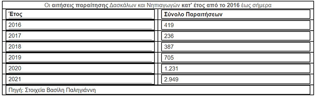 Με βάση τα στοιχεία των υπηρεσιών του Υπουργείου Παιδείας, οι παραιτήσεις των εκπαιδευτικών Πρωτοβάθμιας Εκπαίδευσης για το 2021 είναι 2.949.