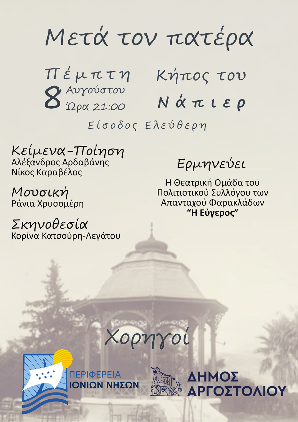 Την Πέμπτη 8 Αυγούστου στον Κήπο ΝΑΠΙΕΡ στο Αργοστόλι & ώρα: 9:00μμ,