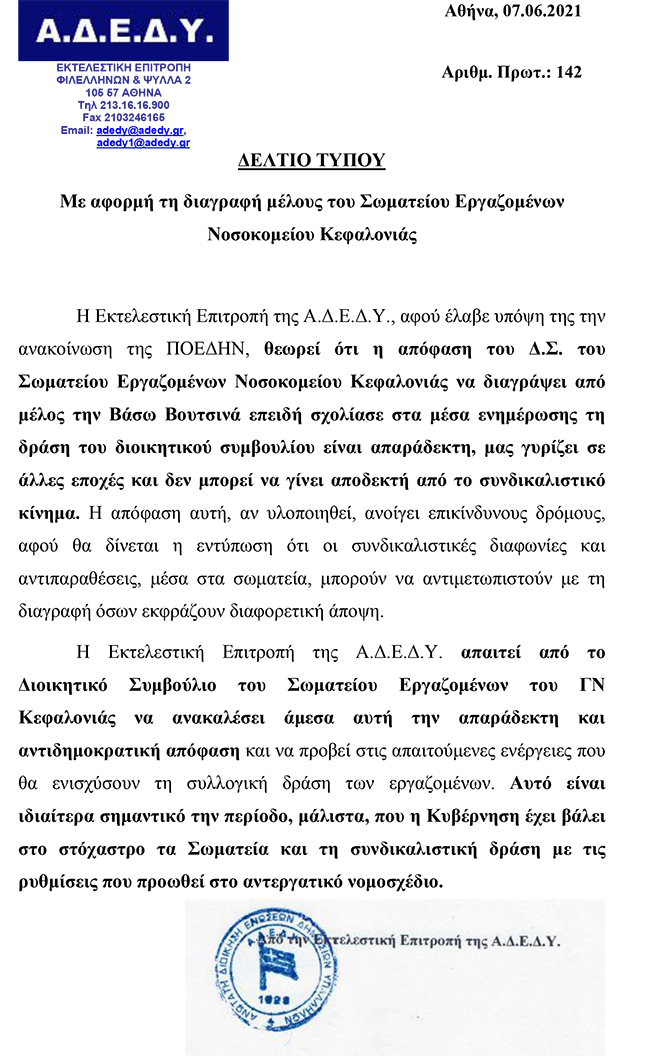 Με αφορμή τη διαγραφή μέλους του Σωματείου Εργαζομένων Νοσοκομείου Κεφαλονιάς