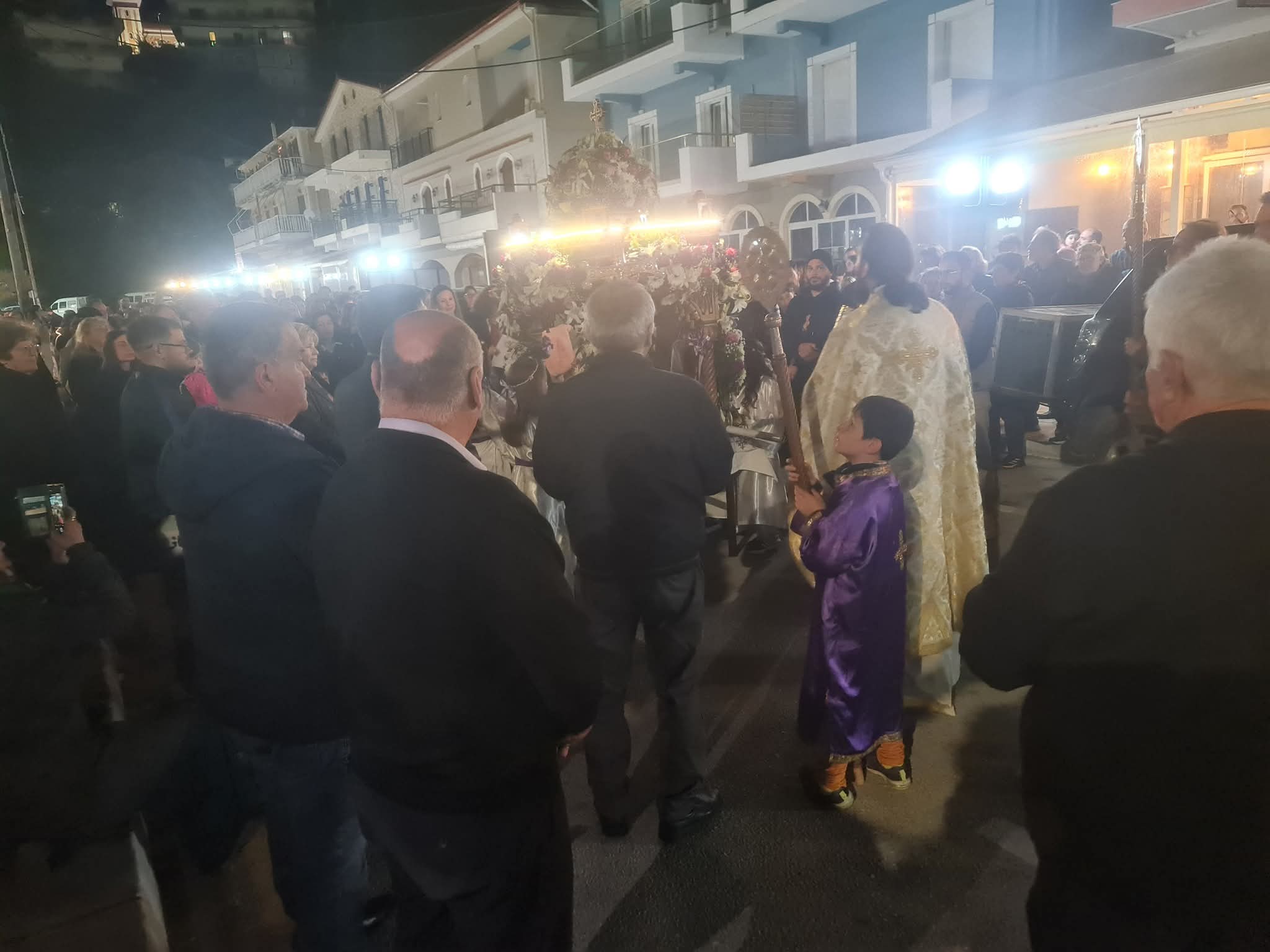 Μετά την ολοκλήρωση της ακολουθίας, ο Επιτάφιος βγήκε σε περιφορά στους κεντρικούς δρόμους και την πλατεία της κωμόπολης μας. Οι πιστοί, ακολουθούσαν με σεβασμό και σιωπή, δημιουργώντας μια ιδιαίτερα συγκινητική εικόνα πίστης και παράδοσης. Ο στολισμένος Επιτάφιος γινόταν δεκτός με ευλάβεια σε κάθε γωνιά που περνούσε, ενώ η ατμόσφαιρα ήταν βαριά από την πένθιμη μεγαλοπρέπεια της ημέρας.