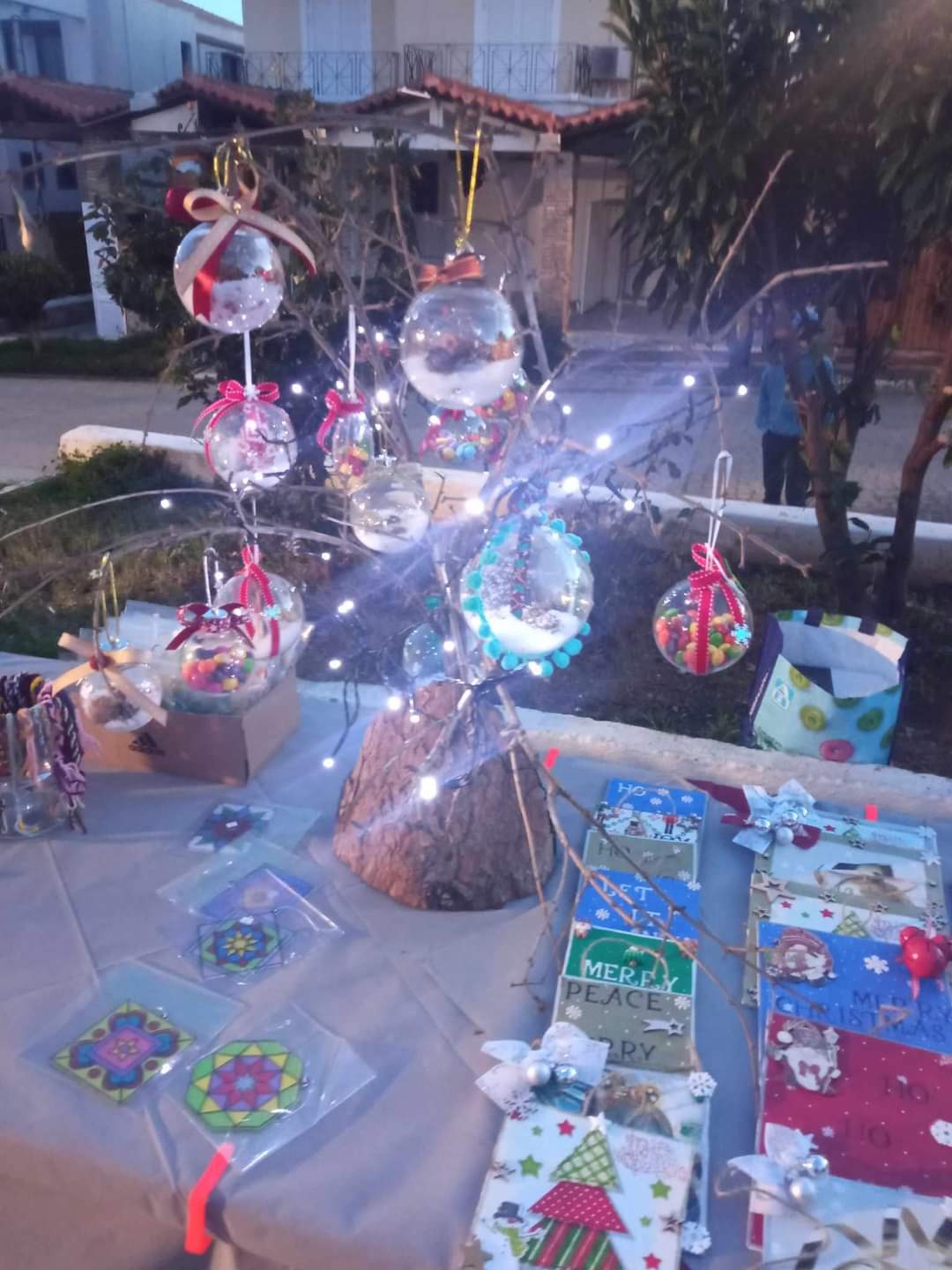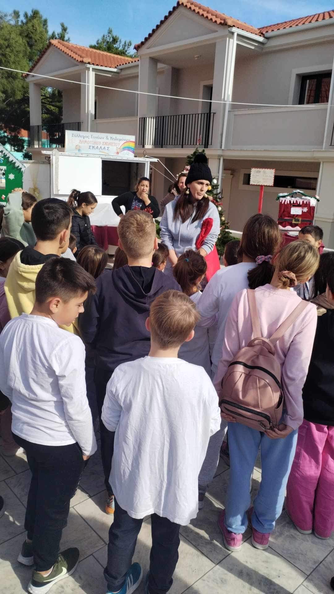 Όπως μας ενημέρωσε ο Σύλλογος Γονέων και Κηδεμόνων της Σκάλας που ήταν ο διοργανωτής των Χριστουγεννιάτικων Εκδηλώσεων: “Με χαρά βρεθήκαμε σε ένα διήμερο μπαζάρ και δράσεων για μικρούς και μεγάλους στη Σκάλα… Σύντομα διαπιστώσαμε ότι ο σύλλογος γονέων και κηδεμόνων του Δημοτικού σχολείου με την πολύτιμη βοήθεια της Κατερίνας Μεγαδούκα είχαν κατασκευάσει ένα χριστουγεννιάτικο χωριό με το έλκηθρο και τους ταράνδους του Αγίου Βασίλη… Τα παιδιά μπορούν να φωτογραφηθούν μαζί με τον Άγιο Βασίλη δίπλα στο τζάκι, επίσης συμμετείχαν σε κυνήγι χαμένου θησαυρού, άκουσαν παραμύθια και ζωγράφισαν μπλουζάκια τα οποία είναι προς πώληση με σκοπό τα έσοδα αυτά να δοθούν στη Φλόγα (του φιλανθρωπικού συλλόγου για τα παιδιά με νεοπλασματικές ασθενειές.)