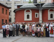 ΦΩΤΟΓΡΑΦΙΑ 2: Ο ιδρυτής του Σχολείου ΕΛΛΑΔΑ, Βλαντίμιρ Σίντοροβ, η δρ Θεοδώρα Γιαννίτση, ο ιερατικώς προϊστάμενος των Αγίων Πάντων Μόσχας, πατήρ Σέργιος, εκπαιδευτικοί και μαθητές και μαθήτριες του Σχολείου στον προαύλιο χώρο του Ναού.