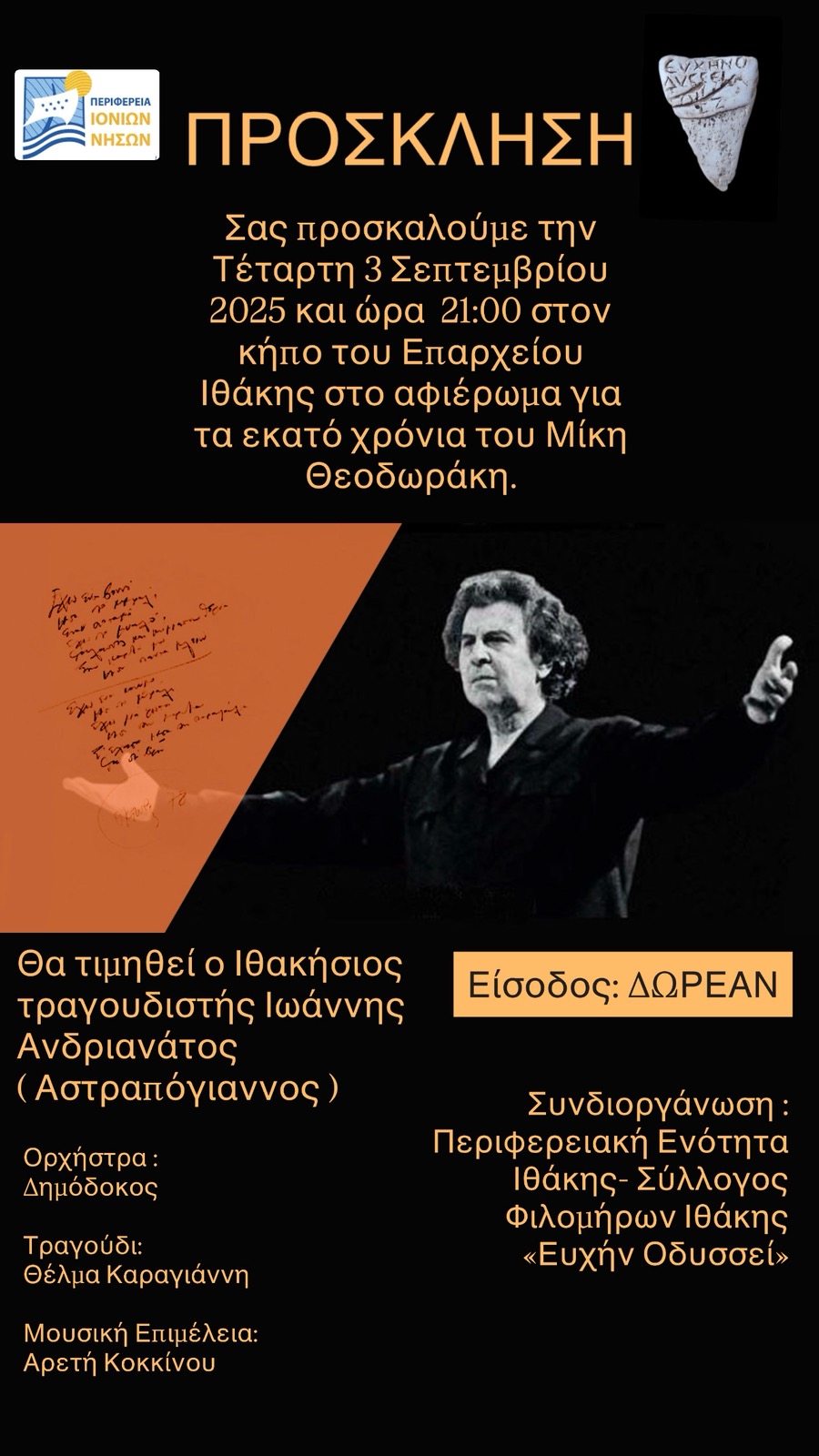 Στον κήπο του Επαρχείου Ιθάκης το μεγάλο αφιέρωμα στο Μίκη Θεοδωράκη και τα αθάνατα τραγούδια του , με ειδική αφιέρωση στο έργο του ” ΟΔΥΣΣΕΙΑ “, σε στίχους του Κ.Καρτελιά, όπου θα τιμηθεί ο π. Έπαρχος και Ιθακήσιος Τραγουδιστής κ. Ιωάννης Ανδριανάτος