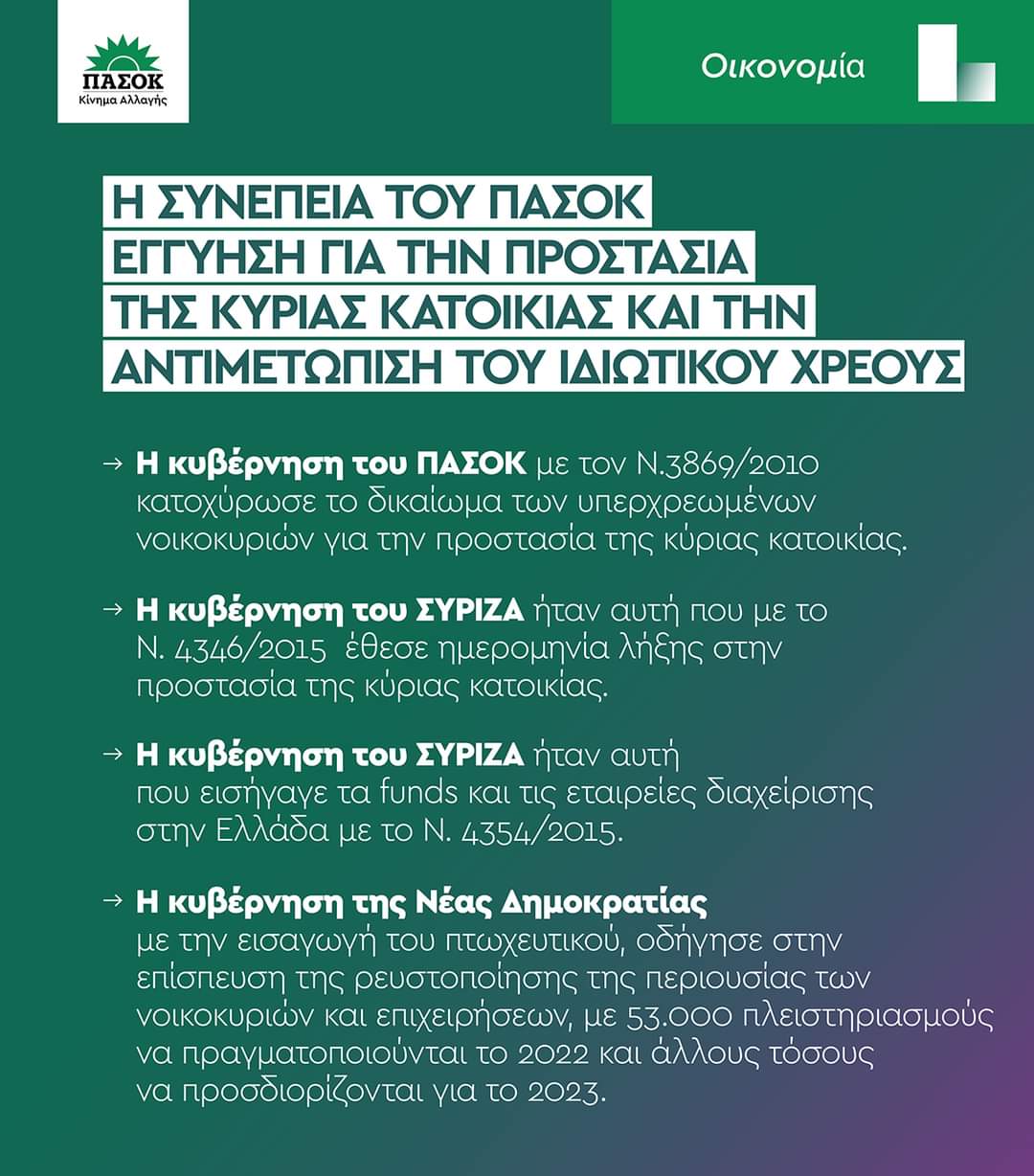 Η Κυβέρνηση του ΠΑ.ΣΟ.Κ. ήταν αυτή που με τον Ν.3869/2010 κατοχύρωσε το δικαίωμα των υπερχρεωμένων νοικοκυριών για την προστασία της κύριας κατοικίας. Εκατοντάδες χιλιάδες νοικοκυριά διέσωσαν τις κατοικίες και πέτυχαν τη ρύθμιση όλων των οφειλών τους με βάση τις πραγματικές τους δυνατότητες. Για τη χώρα μας ο νόμος αυτός ήταν ένα κοινωνικό κεκτημένο. Έναν νόμο που ο ΣΥΡΙΖΑ, ως αντιπολίτευση δεν το ψήφισε, ως κυβέρνηση τον κατήργησε και ουδέποτε, μέχρι και σήμερα, έχει ζητήσει την επαναφορά του.