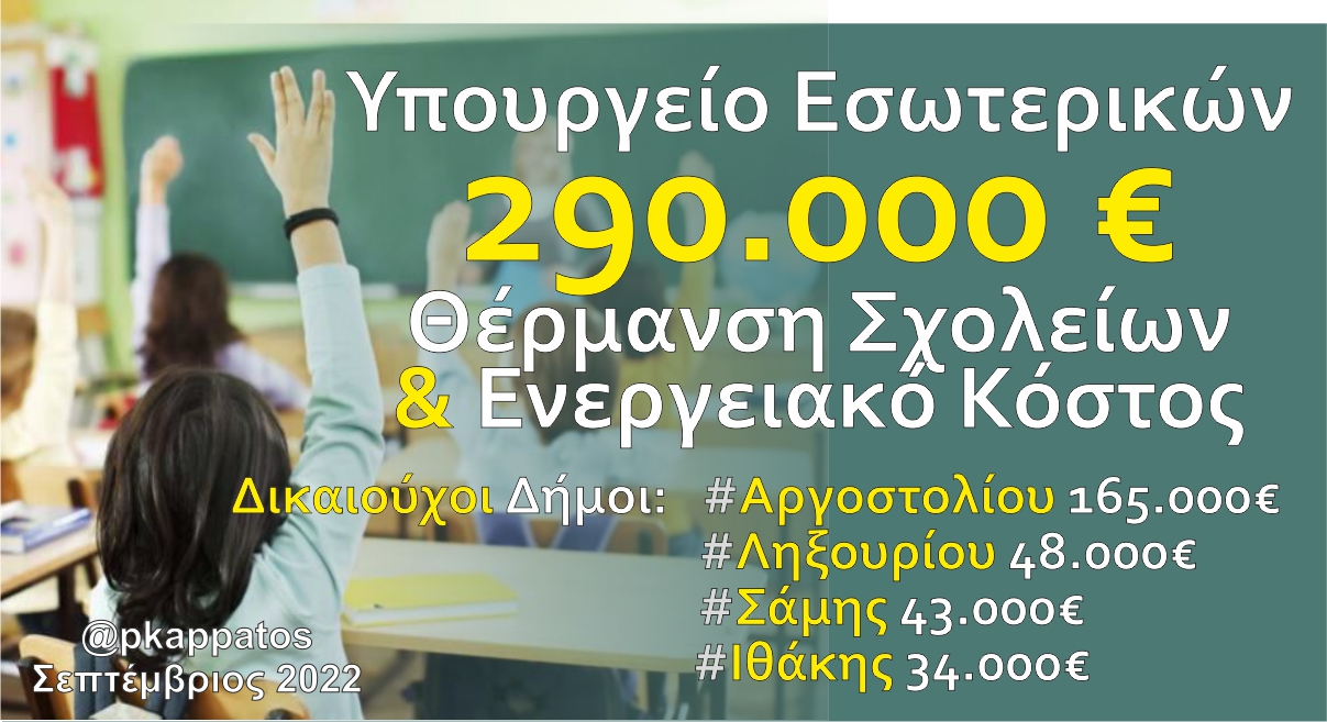 Με αποφάσεις του Αναπληρωτή Υπουργού Εσωτερικών κ. Στέλιου Πέτσα οι Δήμοι της Κεφαλονιάς και της Ιθάκης λαμβάνουν νέα έκτακτη χρηματοδότηση που ανέρχεται συνολικά στα 290.000€ για την αντιμετώπιση του αυξημένου ενεργειακού κόστους και την εξασφάλιση της θέρμανσης των παιδιών μας στα σχολεία.
