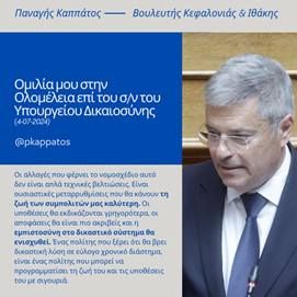 Συμμετείχα με ομιλία μου στην Ολομέλεια της Βουλής των Ελλήνων, όπου συζητήθηκε το νομοσχέδιο του Υπουργείου Δικαιοσύνης με θέμα: «Τροποποίηση του π.δ. 18/1989 «Κωδικοποίηση διατάξεων νόμων για το Συμβούλιο της Επικρατείας» (Α΄ 8) – Μεταφορά διαφορών στα Τακτικά Διοικητικά Δικαστήρια – Ρυθμίσεις για πιλοτική ή κατόπιν προδικαστικού ερωτήματος δίκη ενώπιον του Συμβουλίου της Επικρατείας – Άλλες διατάξεις του Υπουργείου Δικαιοσύνης».