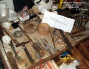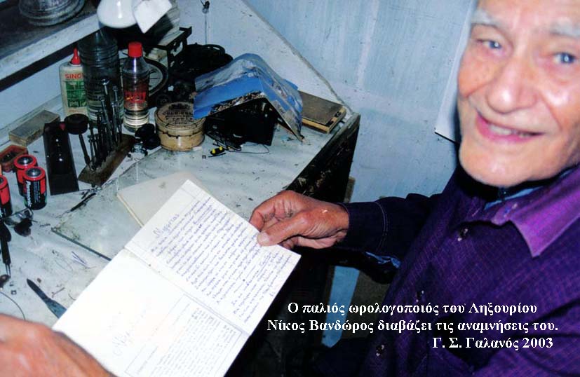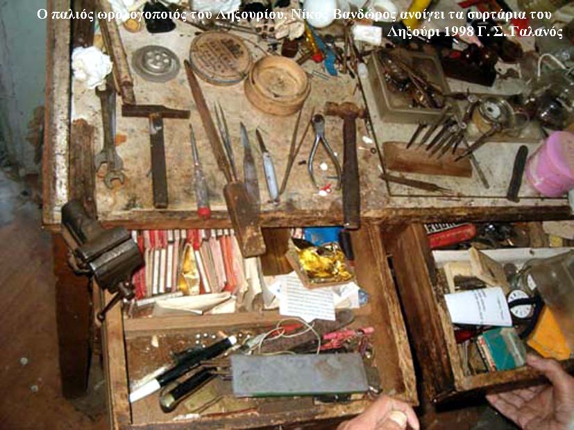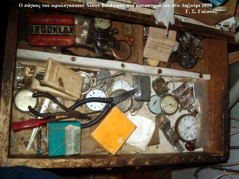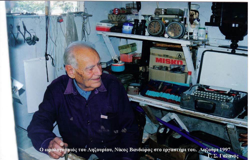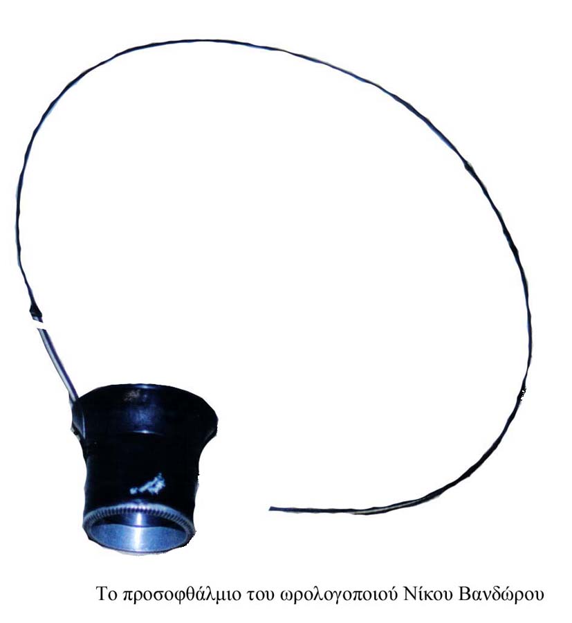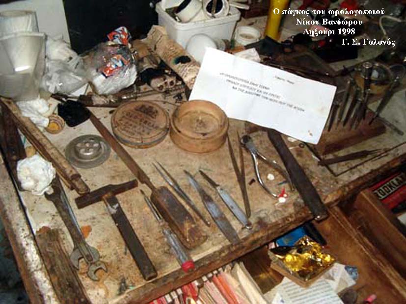 Σκυφτός πάνω σε ένα πάγκο με το προσοφθάλμιο στο μάτι κοιτούσε το εσωτερικό των ρολογιών και τα διόρθωνε εάν είχαν χαλάσει. Μικρά και λεπτά κατσαβιδάκια, λαδωτήρια με πολύ μικρά στόμια, τσιμπίδια, μικρές και μεγάλες βίδες, κουτιά παλιά πορσελάνινα με μικροϋλικό για τα ρολόγια, γρανάζια ρολογιών μικρά και μεγάλα ρουμπίνια, βιδούλες που με δυσκολία τις έπιανε το χέρι και τις διέκρινε το μάτι κατάλληλες για τα ρολόγια, παλιά ρολόγια του τοίχου, επιτραπέζια, του χεριού, μα και της τσέπης και ένα μεγάλο πλήθος από τέτοια πράγματα, συνέθεταν το εργαστήριο του Νίκου Βανδώρου. Το βασικό όμως εργαλείο του ωρολογοποιού ήταν τα προσοφθάλμια που μεγέθυναν στο μάτι το εσωτερικό των ρολογιών για να μπορεί να το διορθώσει εάν υπήρχε πρόβλημα.