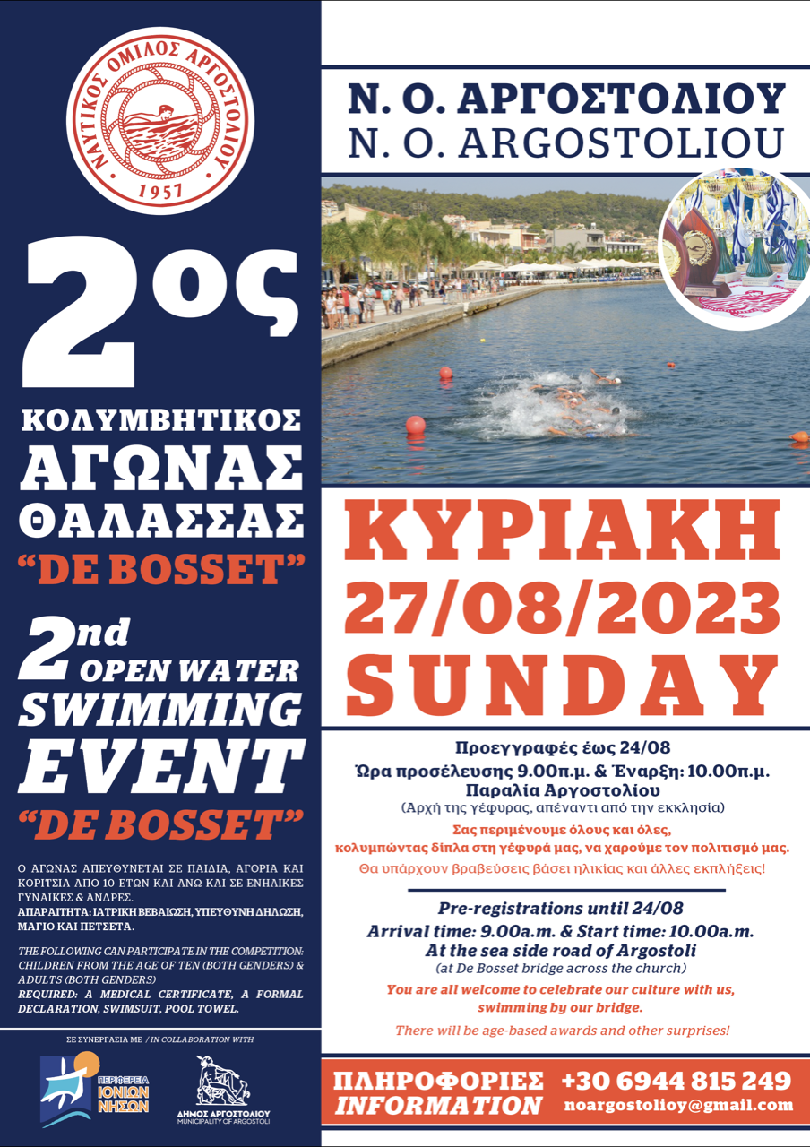 Ο Ναυτικός Όμιλος Αργοστολίου σε συνεργασία με την Περιφερειακή Ενότητα Κεφαλληνίας και το Δήμο Αργοστολίου, διοργανώνει και προκηρύσσει  αγώνες, κολύμβησης ανοικτής θάλασσας με την επωνυμία 2ος Κολυμβητικός Αγώνας Θάλασσας “De Bosset την Κυριακή 27 Αυγούστου 2023, ο οποίος θα λάβει  χώρα στην παραλία δίπλα στη Γέφυρα.