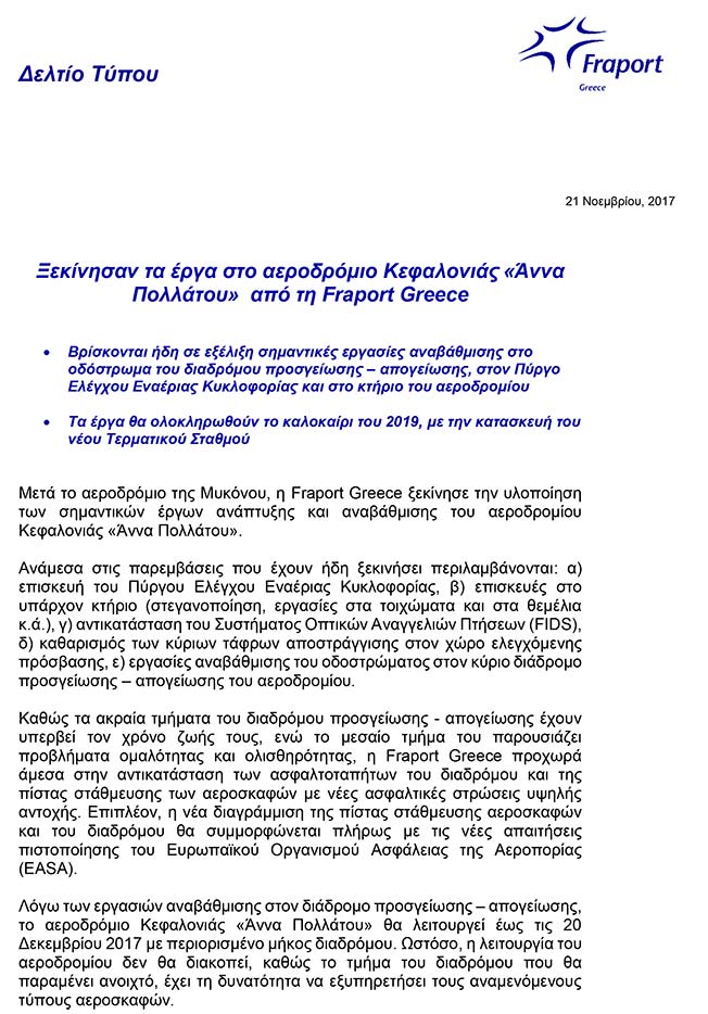 Ξεκίνησαν τα έργα στο αεροδρόμιο Κεφαλονιάς «Άννα Πολλάτου» από τη Fraport Greece