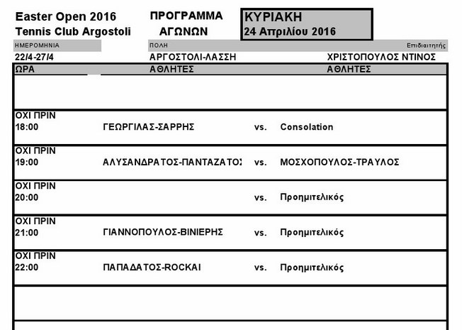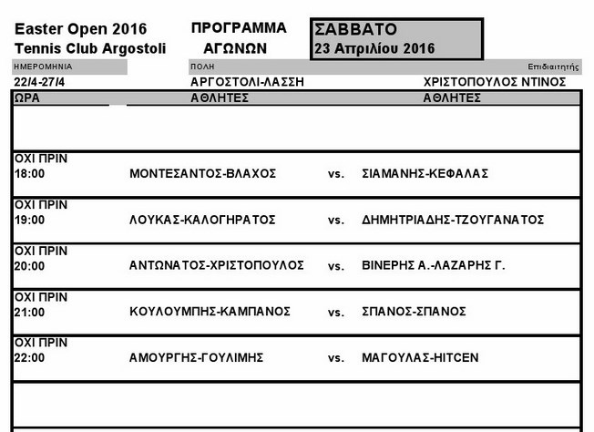 Οι αγώνες διεξάγονται κάθε απόγευμα μέχρι τη μ.Τετάρτη στο Tennis Club Argostoli στη Λάσση.