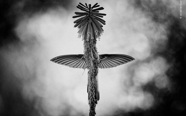 Μια εντυπωσιακή σκηνή της φύσης κατάφερε να καταγράψει με μια κάμερα που «πιάνει»14 καρέ το δευτερόλεπτο ο ολλανδός φωτογράφος Γιαν φαν ντερ Γκριφ. H φωτογραφία που κέρδισε το πρώτο βραβείο στην κατηγορία «Ασπρο και Μαύρο» τραβήχτηκε σε μια περιοχή στο νότιο τμήμα του Περού και δείχνει ένα ενδημικό είδος κολιμπρί να ρουφάει το νέκταρ από το φυτό κνιφόφια που παράγει μακριές μεγάλες όρθιες ταξιανθίες Jan van der Greef / 2018 Wildlife Photographer of the Year