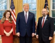 Ο κ. Αθανάσιος Συνοδινός με τη σύζυγό του Ελίζαμπεθ και τον πρόεδρο Τραμπ, λίγο μετά την επίδοση των διαπιστευτηρίων του.