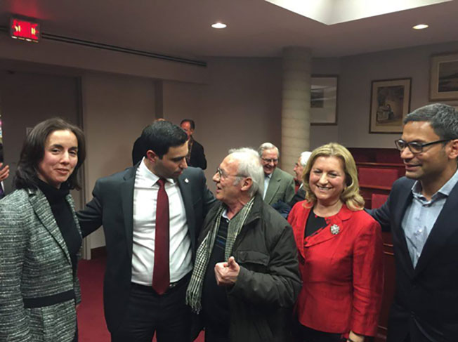 Από δεξιά της φωτογραφίας, ο βουλευτής του Κεμπέκ κ. Σκλαβούνος Γεράσιμος, η κυρία Μπακοπάνου Ελένη πρώην βουλευτής και ανώτατο στέλεχος του κόμματος των φιλελευθέρων του Καναδά, ο καθηγητής κ. Γαβριήλ Μανωλάτος που συνομιλεί με τον βουλευτή του Καναδά κ. Φραγκισκάτο Παναγιώτη.