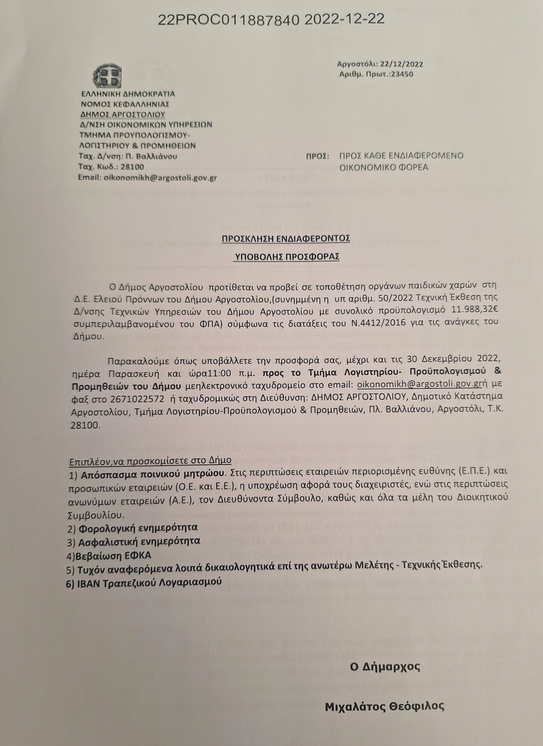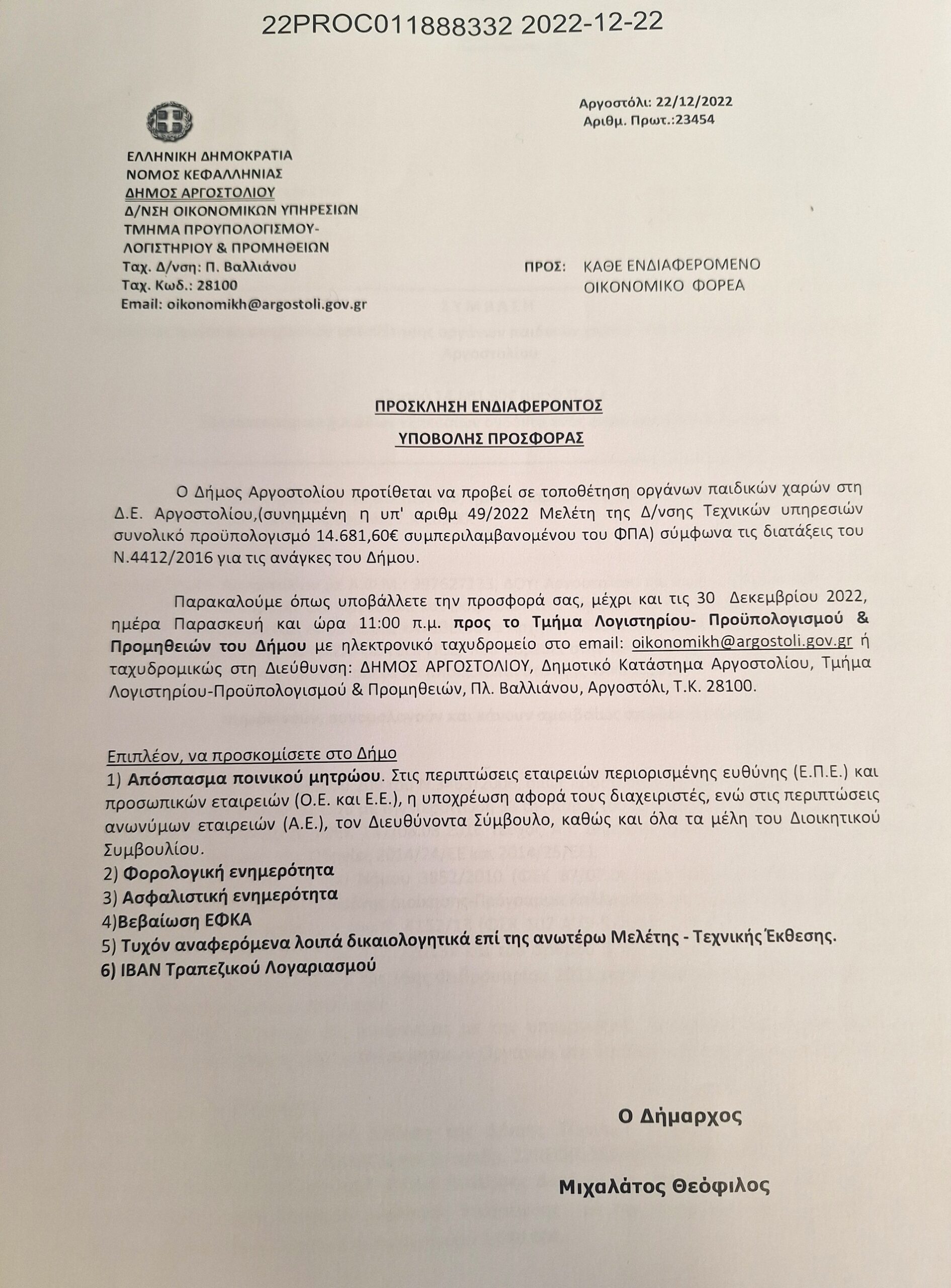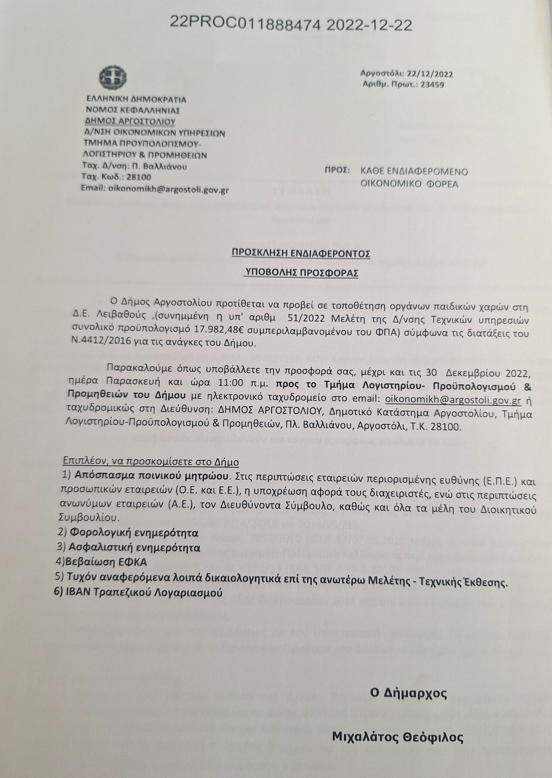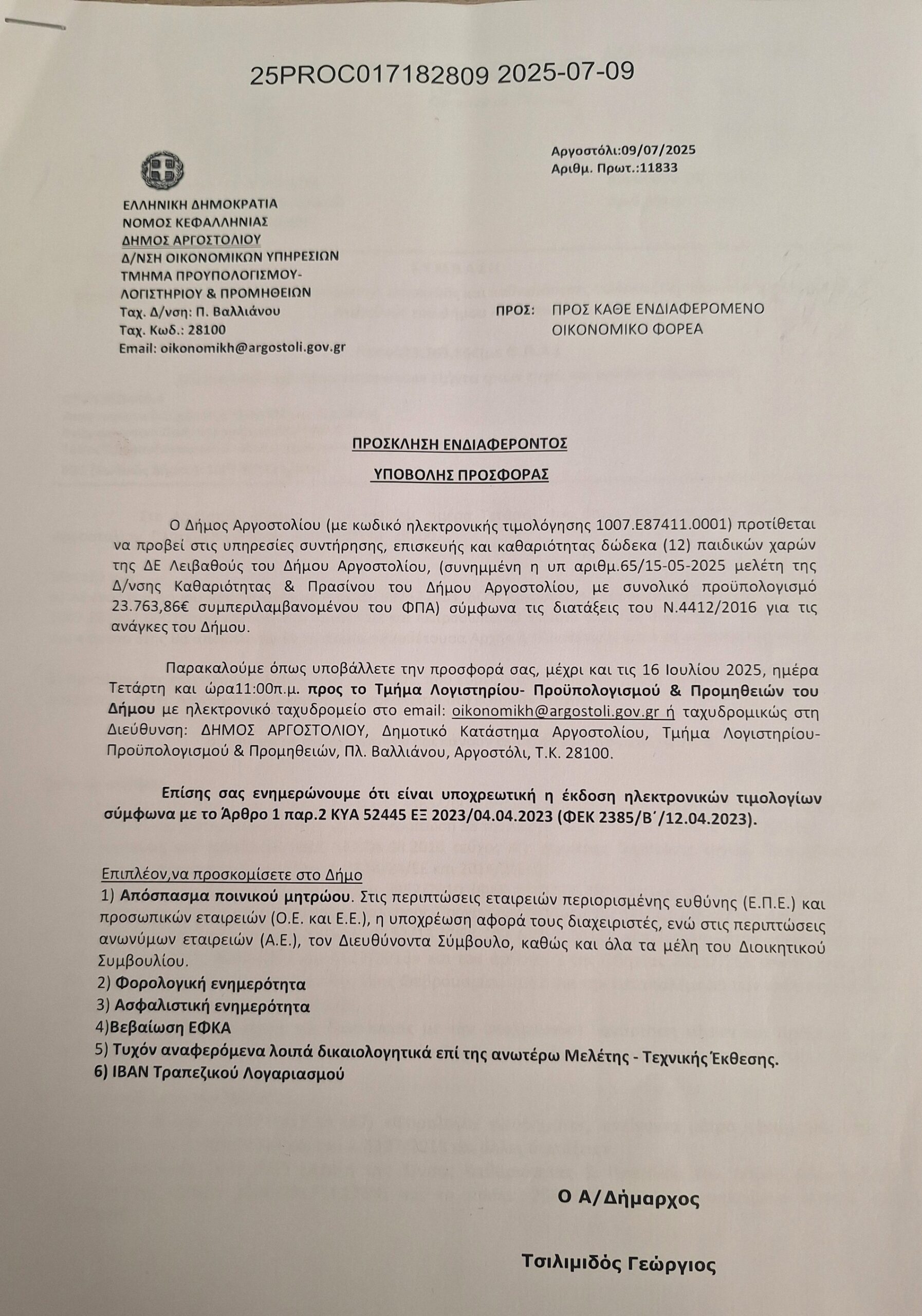Από το Γραφείο Δημάρχου Αργοστολίου