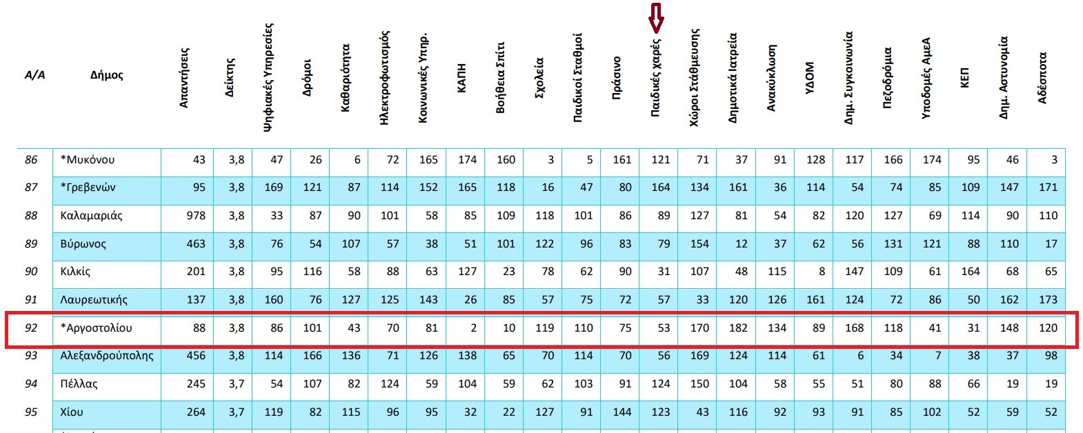 Σύμφωνα με την Έκθεση Αξιολόγησης Δημοσίων Υπηρεσιών του Υπουργείου Εσωτερικών (Μάιος 2025, σελίδα 107, αριθμός 92), ο Δήμος Αργοστολίου κατατάσσεται στην 53η θέση μεταξύ 184 δήμων στην κατηγορία «Παιδικές Χαρές».