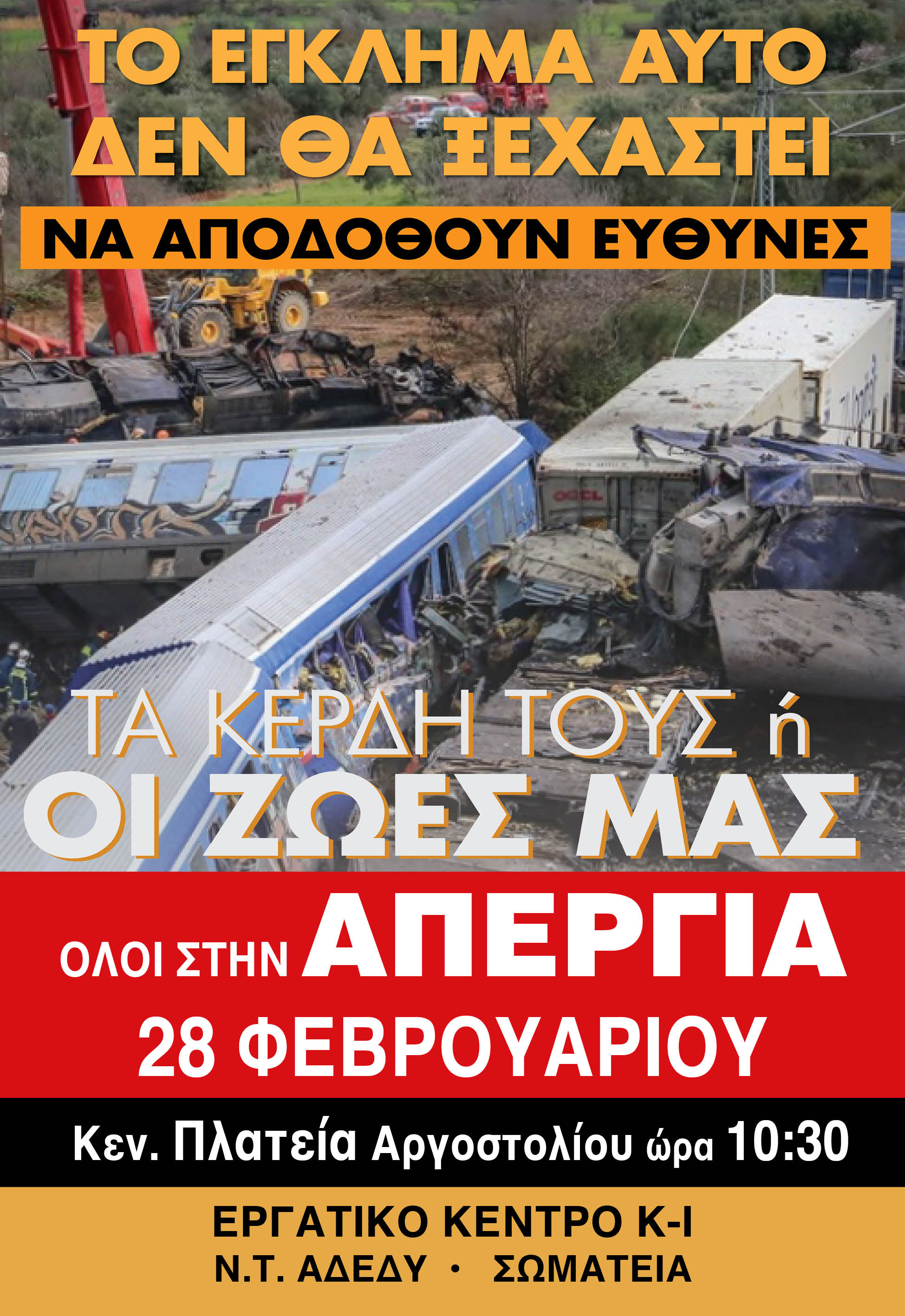 Στις 28 Φεβρουαρίου συμπληρώνεται ένας χρόνος από το φριχτό κρατικό και εργοδοτικό έγκλημα των Τεμπών, που είχε θύματά του 57 ανθρώπους, στην πλειοψηφία τους νέους. Το σύνθημα “ Ή τα κέρδη τους οι ή ζωές μας “ που συγκλόνισε τις μέρες εκείνες όλη τη χώρα, πρέπει να ακουστεί ξανά, ακόμα πιο δυνατά. Να μπει για άλλη μια φορά στην προμετωπίδα των διεκδικήσεών μας.