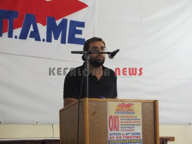 Στην ομιλία του τόνισε ιδιαίτερα τα εξής: Οργανώνουμε την εργατική λαϊκή απάντηση στο νέο κύμα επίθεσης που έχει εξαπολύσει η συγκυβέρνηση ΣΥΡΙΖΑ-ΑΝΕΛ υλοποιώντας τις κατευθύνσεις της Ε.Ε. Μπορούμε ν’ ανατρέψουμε τις αρνητικές εξελίξεις σε βάρος μας και να μη συνθηκολογήσουμε στο γκρέμισμα όποιου δικαιώματος έχει απομείνει! Να γίνουμε εμείς πρωταγωνιστές των εξελίξεων!