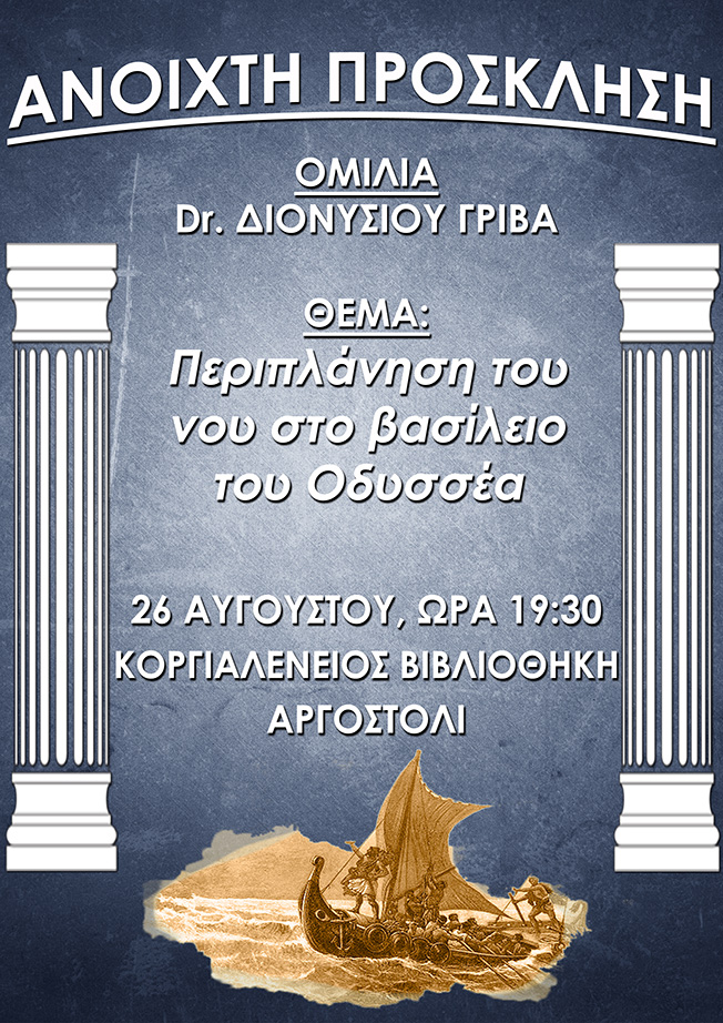 Ομιλία του Dr Διονυσίου Γρίβα με θέμα: Περιπλάνηση του νου στο βασίλειο του Οδυσσέα. 26 Αυγούστου ώρα 19.30 Κοργιαλένειο Βιβλιοθήκη Αργοστόλι.