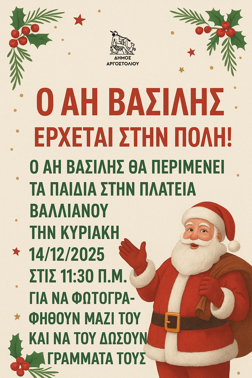 Ο Άη Βασίλης θα περιμένει τα παιδιά στην πλατεία Βαλλιάνου την Κυριακή 14 Δεκεμβρίου 2025, στις 11.30 π.μ., για να φωτογραφηθούν μαζί του και να του δώσουν γράμματά τους.