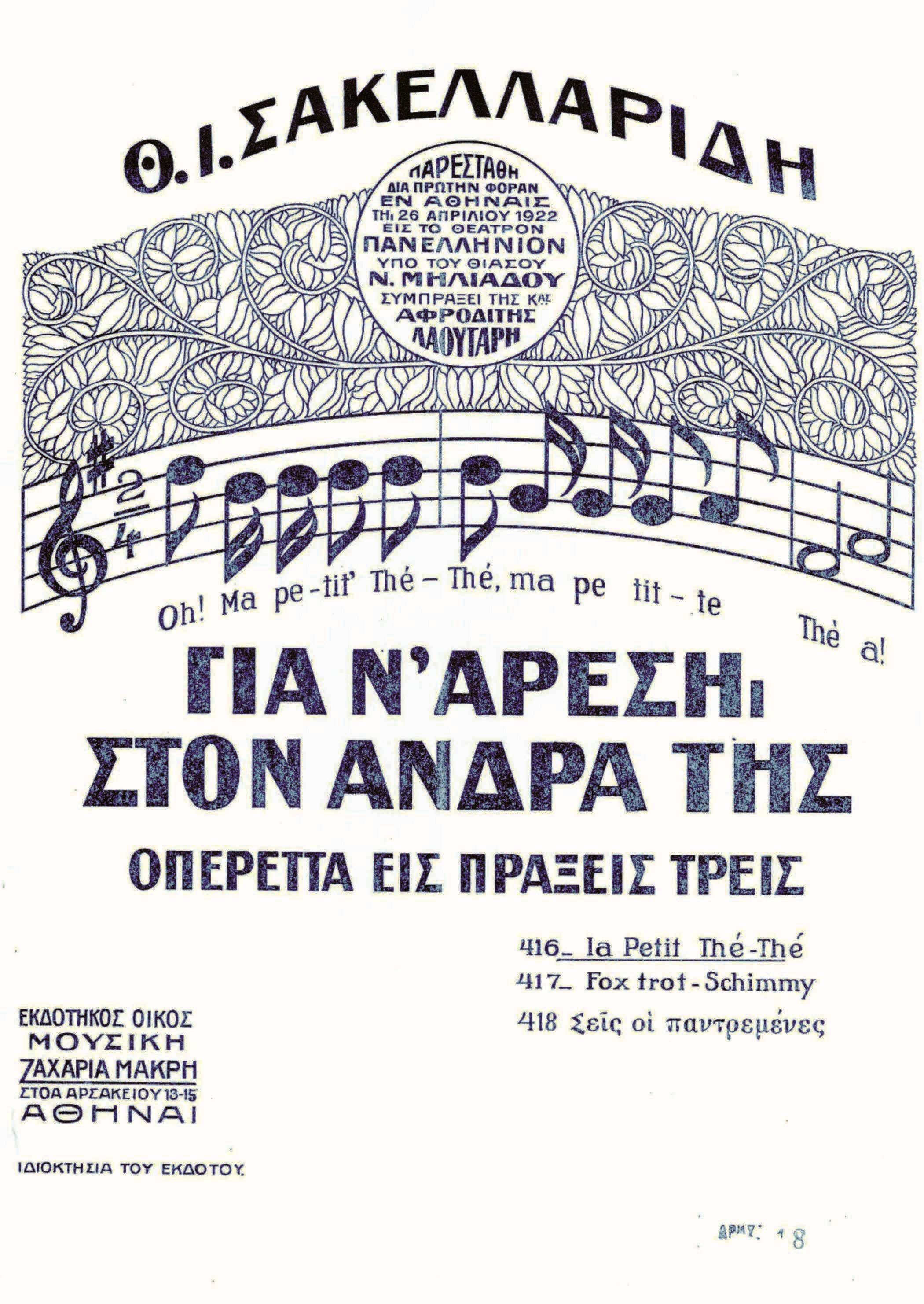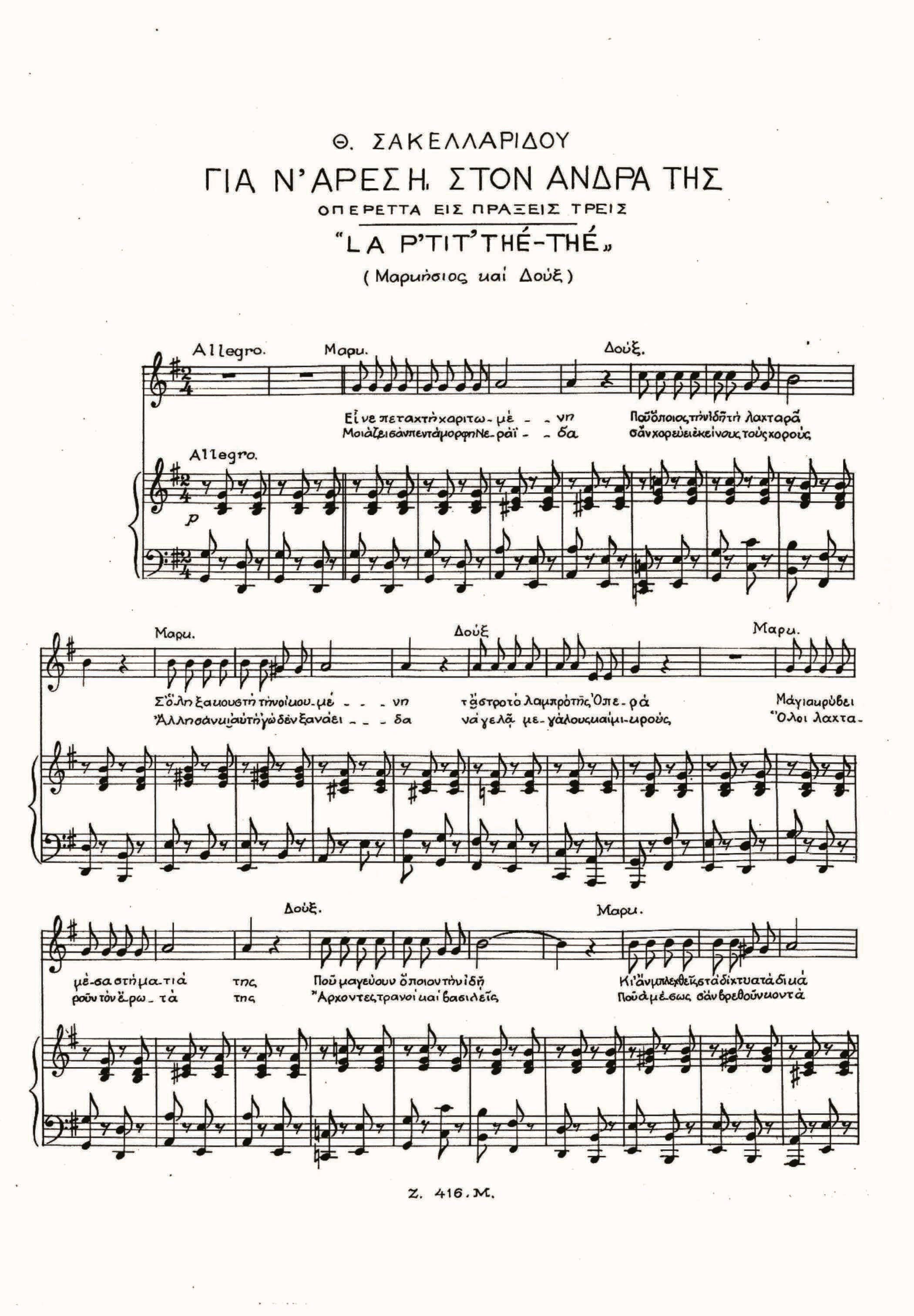 Στις δυο προαναφερόμενες χορωδιακές παρουσιάσεις ακούστηκε το «κανταδοποιημένο» άσμα που όλοι έχουμε ακούσει, η «ΤΕΤΕ». Πρόκειται για ένα υπέροχη καντάδα παρμένη από την οπερέτα του Θ. Ι. Σακελλαρίδη, «Για ν’ αρέση , στον άνδρα της», Οπερέττα εις πράξεις τρείς , την οποία πρωτοφανέρωσε ως μουσικό άκουσμα με τη δική του χορωδία και μαντολινάτα, ο αλησμόνητος μουσουργός Φώτης Αλέπορος. Μάλιστα σε κάποιο σημείο που το ποιητικό κείμενο περιέχει μια μικρή γαλλική φράση , την τροποποίησε με δικό του ερμηνευτικό στίχο και μας την έκανε γνωστή, ως υπέροχη πεταχτή καντάδα με τις χορωδίες του.