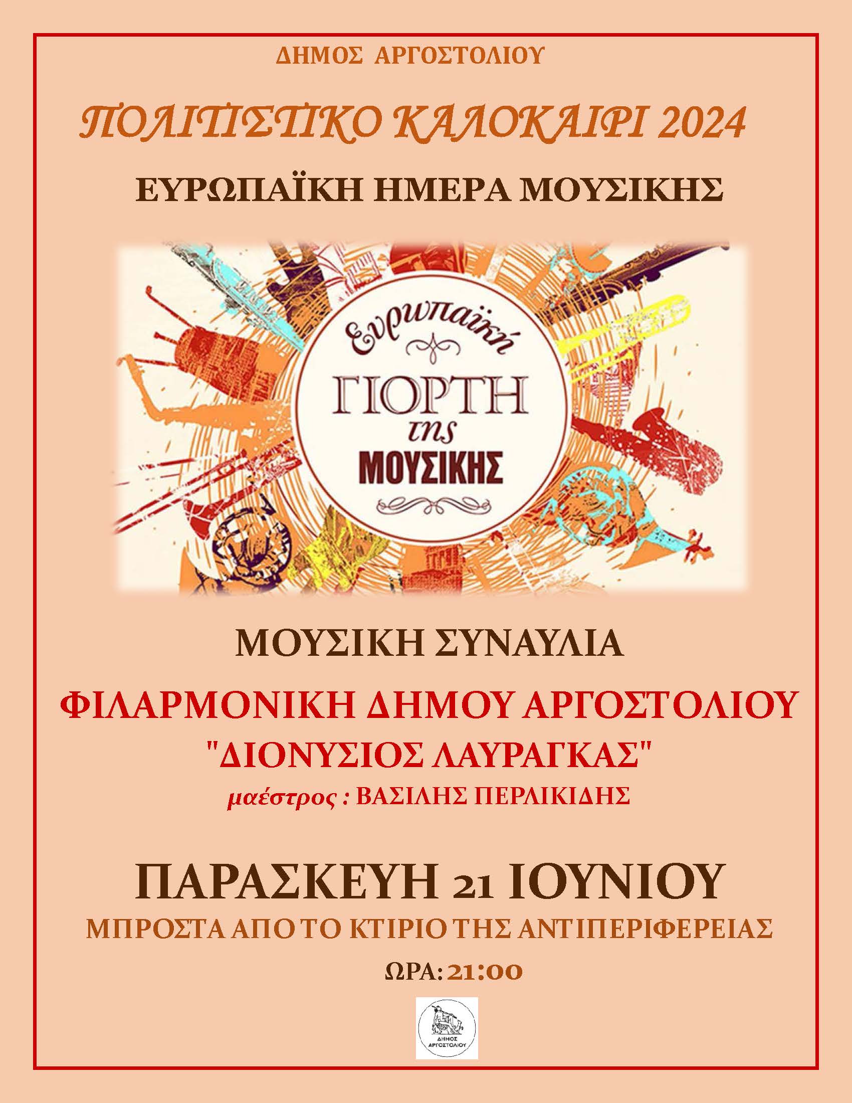 Με αφορμή την Ευρωπαϊκή Ημέρα Μουσικής που γιορτάζεται στις 21 Ιουνίου, ο Δήμος Αργοστολίου, θα παρουσιάσει την Παρασκευή 21/6 στις 9.00μμ μπροστά από το κτίριο της Αντιπεριφέρειας, μουσική συναυλία με ξένο και ελληνικό ρεπερτόριο, με την Φιλαρμονική Δήμου Αργοστολίου “Διονύσιος Λαυράγκας” με μαέστρο τον Βασίλη Περλικίδη.