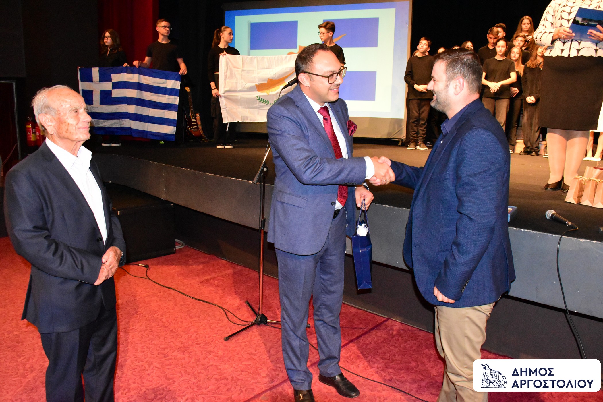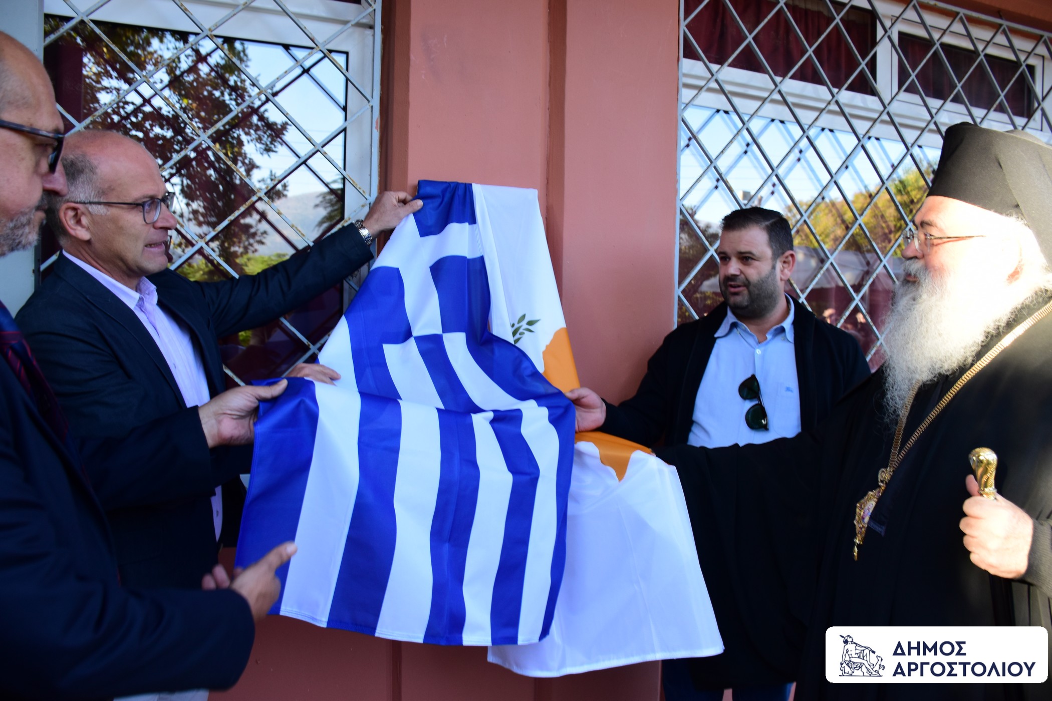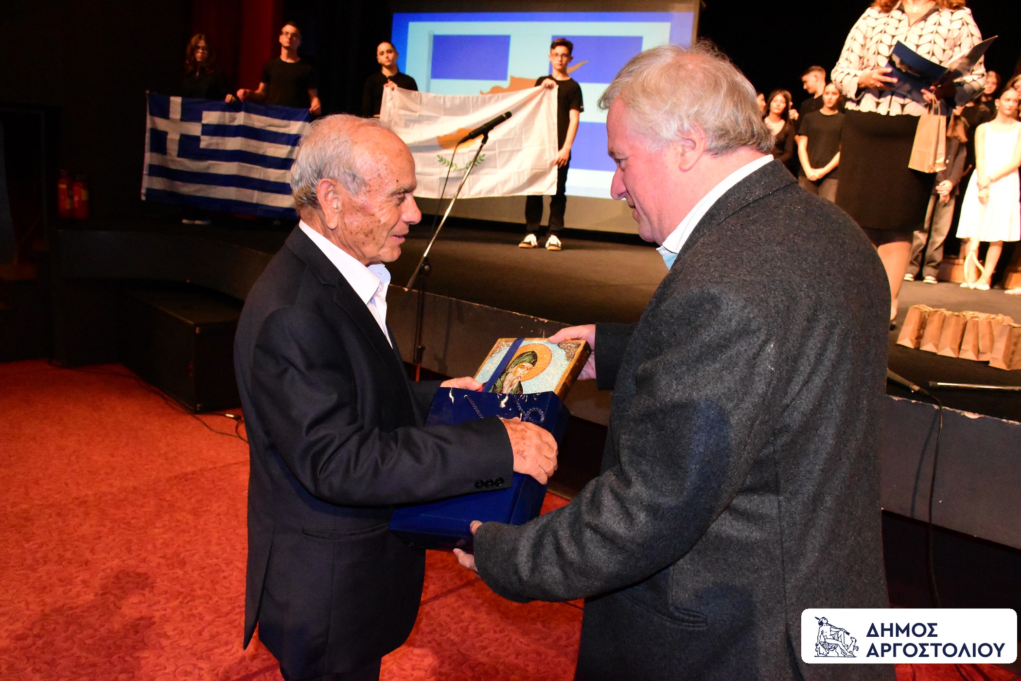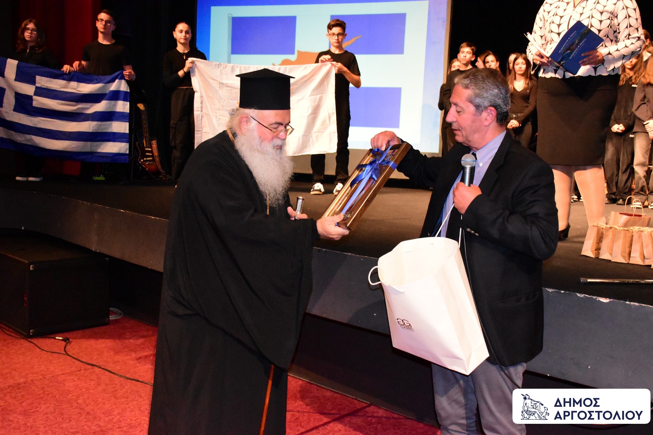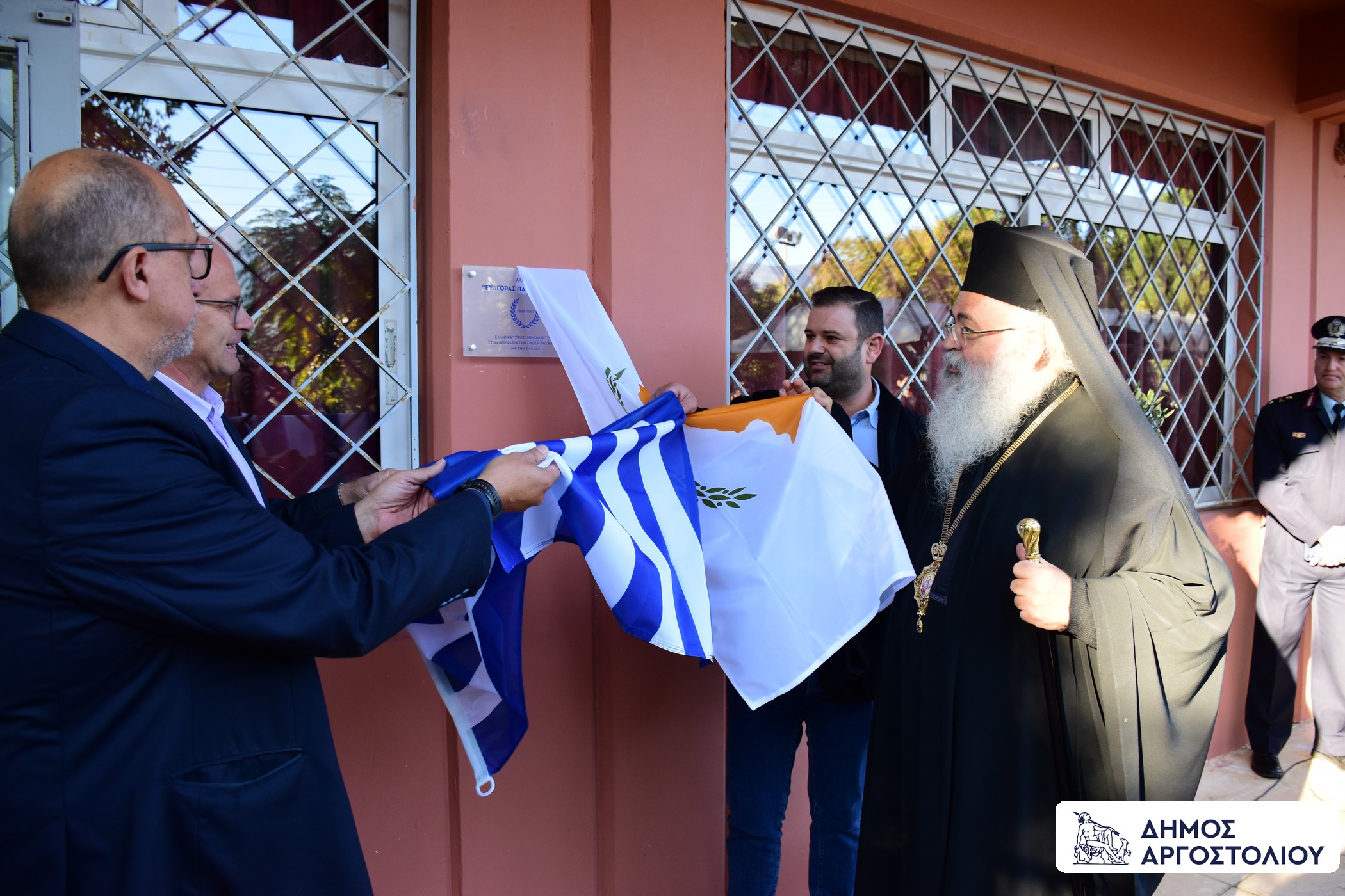 Ο Δήμος Αργοστολίου, τίμησε με αναμνηστικά δώρα, τον μακαριώτατο Αρχιεπίσκοπο Πάσης Κύπρου και Νέας Ιουστινιανής, κ.κ. Γεώργιος, τον Δημοτικό Σύμβουλο Δήμου Πάφου και Αντιπρόεδρο του Πολιτιστικού Συλλόγου ‘’Ευαγόρας Παλληκαρίδης’’ κ. Γιώργο Πίτρο, καθώς και τον συναγωνιστή του Ευαγόρα Παλληκαρίδη, κ. Γιώργο Στενιώτη.