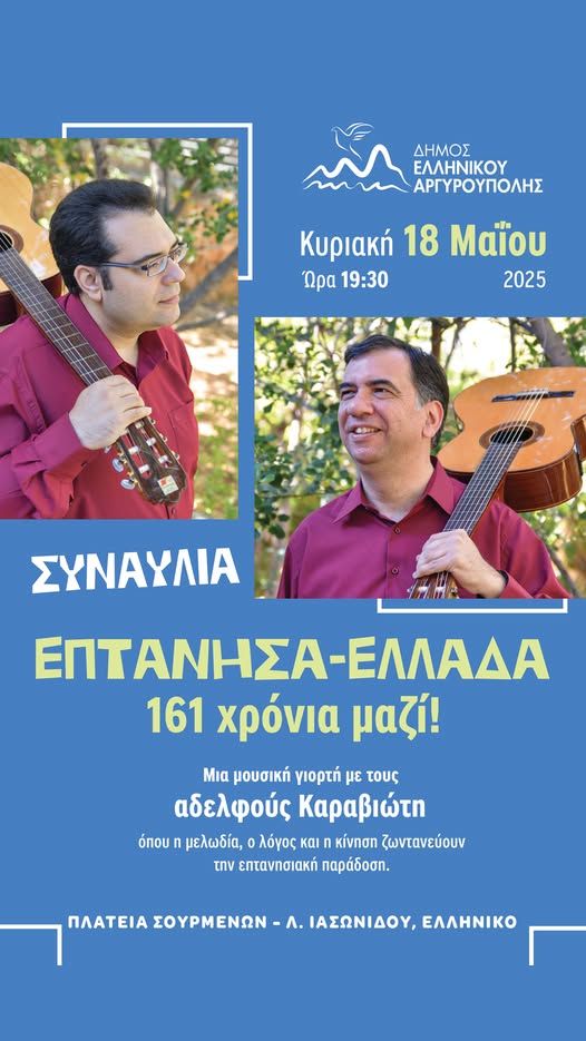 Ο Δήμος Ελληνικού-Αργυρούπολης προσκαλεί σήμερα 18 Μαίου 2025 στις 19:30 στην πλατεία Σουρμένων όλους τους πολίτες και δη τους επτανήσιους των νοτίων προαστίων Αττικής σε μια ξεχωριστή μουσική βεγγέρα με τους Κεφαλλήνιους αδελφούς Καραβιώτη με την ευκαιρία εορτασμού της 161ης επετείου της ενσωμάτωσης των επτανήσων με τον εθνικό κορμό της Ελλάδας!