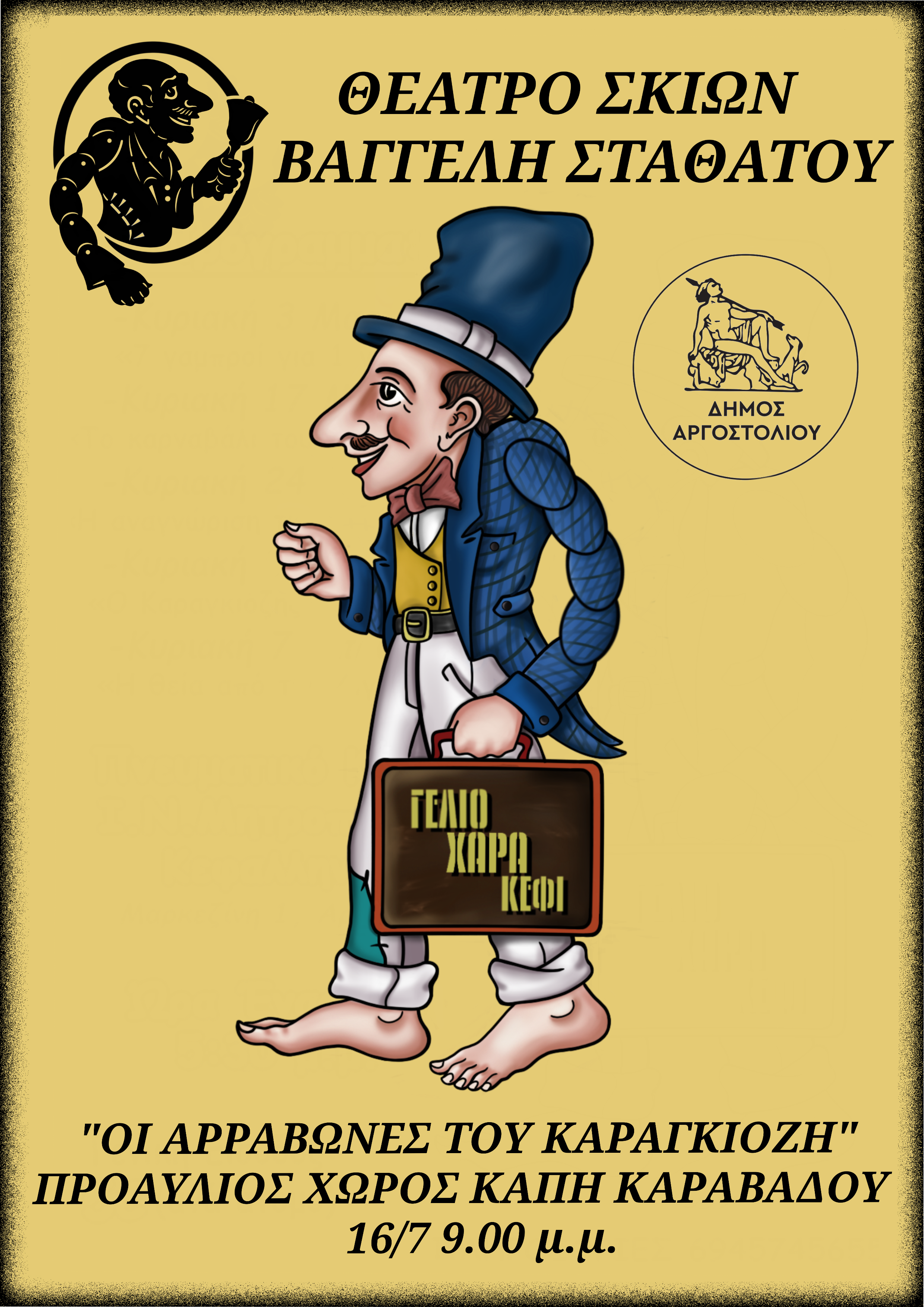 Στον προαύλιο χώρο του ΚΑΠΗ στον ΚΑΡΑΒΑΔΟ, στις 9:00, σήμερα ο Καραγκιόζης, θα μας περιμένει για να απολαύσουμε τη ξεκαρδιστική κωμωδία «Οι Αρραβώνες του Καραγκιόζη» από το θέατρο σκιών του Βαγγέλη Σταθάτου! Οργάνωση Δήμος Αργοστολίου. Είσοδος ελεύθερη.