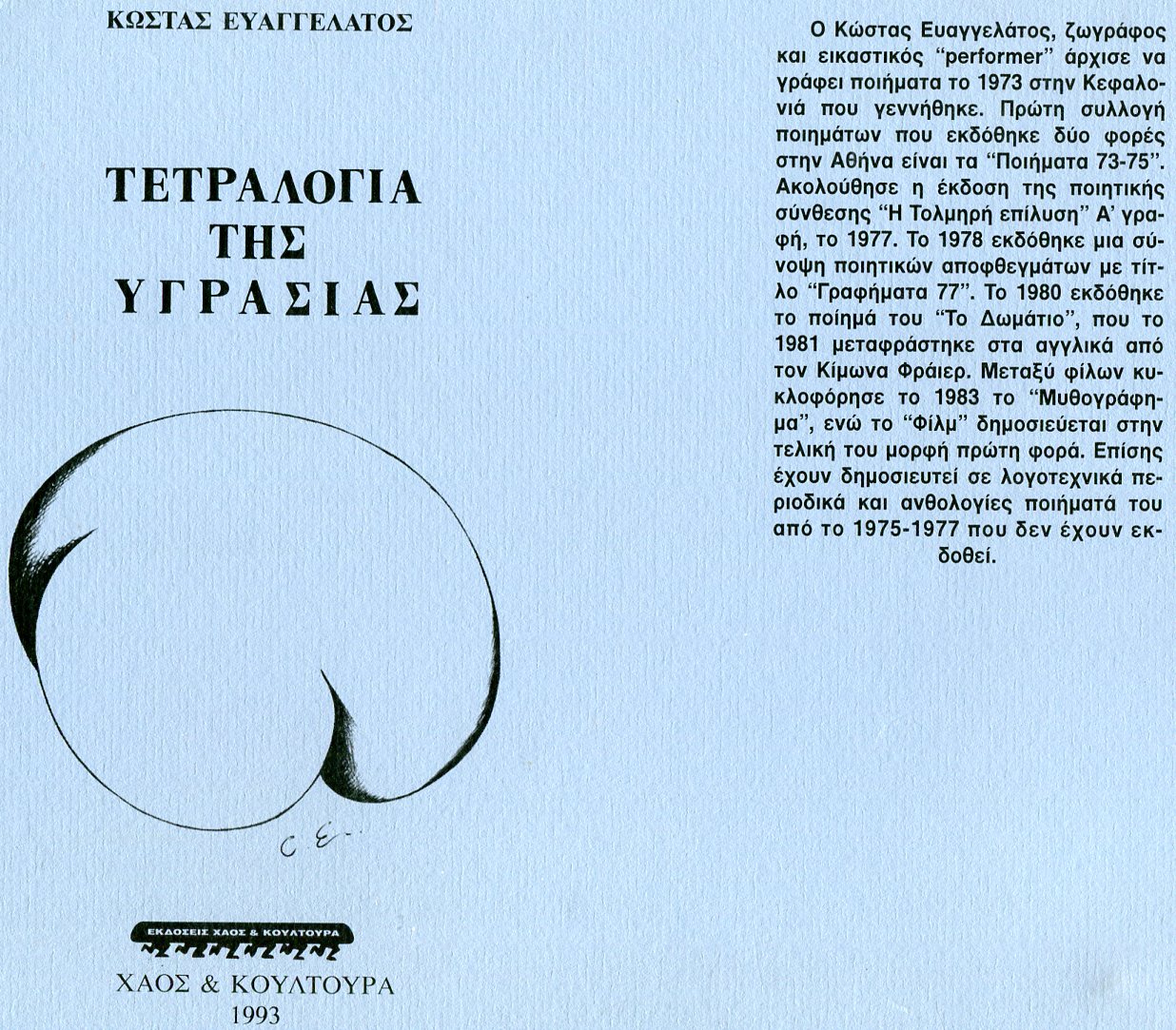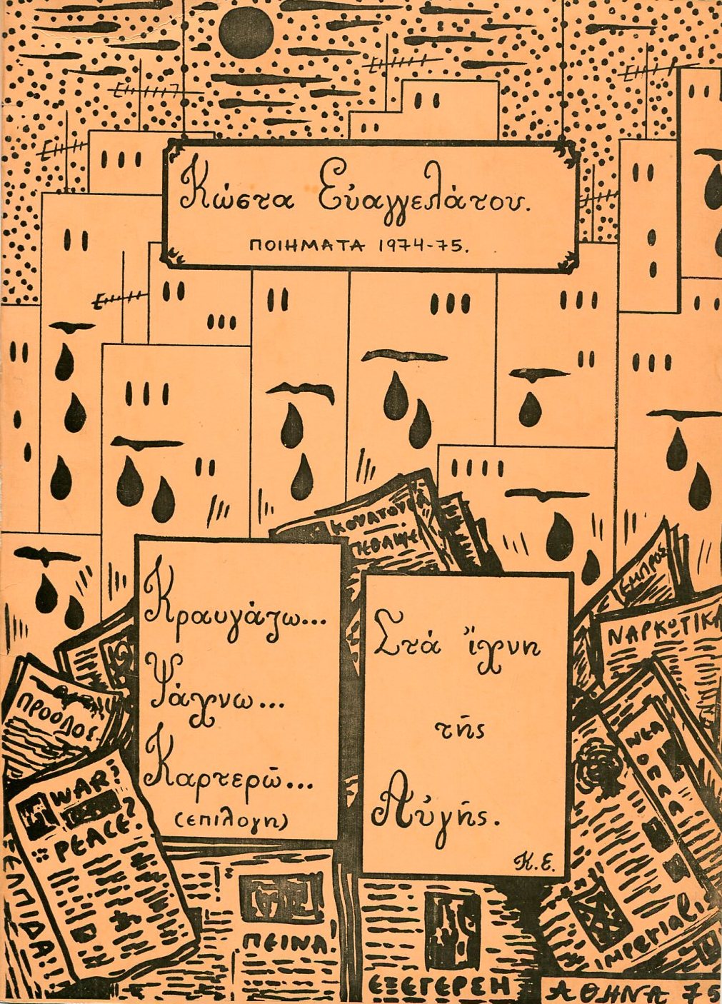 Ας δούμε λοιπόν τις λέξεις: Εγκάρσιος είναι αυτός που τέμνει κατά μήκος ή κατά πλάτος. Η αρχική σημασία δηλώνει αυτόν που διασχίζει, που τέμνει καθέτως, ενώ ετυμολογικά αποδεικνύεται από τους γλωσσολόγους ομόρριζο με τον κορμό, σώμα δηλαδή χωρίς τα άκρα, τον κουρέα που κόβει τα μαλλιά (στα αρχαία κείρει) αλλά και το κέρμα, που κι αυτό κόβεται ως κατασκευή. Όσο για την πτήση, το πέταγμα, δεν αναφέρεται προφανώς σ’ εκείνη των πουλιών, των πετεινών του ουρανού ή σ’ εκείνη των αεροπορικών εταιρειών. Αναφέρεται κατά μεταφορά της έννοιας σε κάθε προσπάθεια για το ανέβασμα της ανθρώπινης προσωπικότητας, για την εξύψωση του πνεύματος, για την προς τα άνω κίνηση ιδεών και αισθημάτων. Η πτήση είναι ομόρριζη με τα πτερά αλλά και με την πτώση που αποτελεί τον κίνδυνο σε κάθε τέτοια προσπάθεια, σε κάθε πτήση. Μπορεί λοιπόν και στον τίτλο να εμπεριέχονται τέτοιες εννοιολογικές συσχετίσεις. Η Εγκάρσια πτήση δεν αναφέρεται μόνο στον τίτλο. Σε ένα από τα «23 graffiti ψυχών» (το ένατο) διαβάζουμε: «…Στον καμβά της πλάτης σου / φύτρωσαν φτερά./ Εγκάρσια ταξιδεύεις». Επιβεβαιώνονται έτσι οι γλωσσικές συσχετίσεις που προηγήθηκαν, όπως και στο ομώνυμο ποίημα «Εγκάρσια πτήση» (ΙΙΙ) με την πτώση να ελλοχεύει και τον ποιητή να ψάχνει «…στα αποτυπώματα ευάλωτων πελμάτων / ανθρώπων που εγκάρσια βυθίζονται στη γη». Αυτή η συλλογή του Κώστα Ευαγγελάτου περιλαμβάνει συνολικά 40 ποιήματα μοιρασμένα σε τρεις ενότητες. Η πρώτη ενότητα απαρτίζεται από 23 graffiti. Ξέρετε καλά τη λέξη, που ορίζεται ως ζωγραφικό σχέδιο, αρχικά γράμματα ή συνθήματα και που ζωγραφίζονται με σπρέι πάνω σε χτισμένες επιφάνειες, τοίχους ή πεζοδρόμια. Ακόμα αποτελούν τρόπο προσωπικής έκφρασης αλλά και διαμαρτυρίας. Αν μεταφέρετε τον ορισμό του graffiti, έχετε ακριβώς την προσέγγιση αυτών των ποιημάτων. Πάνω στους άδειους τοίχους του σύγχρονου ατόμου ο ποιητής επιχειρεί να αποτυπώσει τα δικά του μηνύματα, τις χρωματιστές του εικόνες, τις διαμαρτυρίες. Θα δούμε κάποια από αυτά, τα ολιγόστιχα όπως και τα συνθήματα των graffiti, ποιήματα του. Και πρέπει να είναι ολιγόστιχα και ολιγόλεξα γιατί πρέπει να έχουν πυκνό περιεχόμενο, να αποτυπώνονται εύκολα στο μυαλό και να γράφονται γρήγορα στους τοίχους -λόγια και εικόνες. Στο δευτέρο τρίστιχο των graffiti διαβάζουμε: «Παλιοί νεκροί σου γνέφουν / και σ’ αγκαλιάζουν στοργικά. / Δεν θέλεις να ξυπνήσεις», δεν θέλεις δηλαδή, έχοντας προηγουμένως γνωρίσει το καλό και το αγαθό, να αποδεχθείς μια οδυνηρή πραγματικότητα και βρίσκεις την παρηγοριά στις ονειροπολήσεις σου. Ο απομονωτισμός και οι ατομικές λύσεις, όμως, δεν οδηγούν σε πτήσεις. «Κλεισμένος στο δωμάτιο / διαβάζεις την Παλατινή ./ Σερφάρεις στον Μεσαίωνα / ακούς Φωρέ και Σούμπερτ / κοιμάσαι με τ’ αγάλματα» γράφει. Αλλά όσο κι αν αυτά προσφέρουν αισθητική απόλαυση λείπει το κοινό στοιχείο που έχει δημιουργήσει και συνέχει, δηλαδή συγκρατεί, όλα τα πιο πάνω. Βεβαίως η αγάπη των δικών μας ανθρώπων γλυκαίνει και παρηγορεί ατομικά, αλλά δεν είναι τελεσφόρα σε κοινωνικό επίπεδο. «Σ’ αναζητάει / ο πιστός σου σκύλος. / Γαβγίζει τους υποκριτές. / Γλείφει τα δάκρυά μας». Διάφορα τέτοια υποστηρικτικά συστήματα εξετάζει με το δικό του λιτό ποιητικό τρόπο. Νομίζω όμως ότι την απάντησή του την έχει δώσει πριν να θέσει τα ερωτήματα, πριν ακόμα να εξετάσει τα δεδομένα, αμέσως στο πρώτο τρίστιχο της ενότητας των γκράφιτι: «Νύχτες φυτεύεις