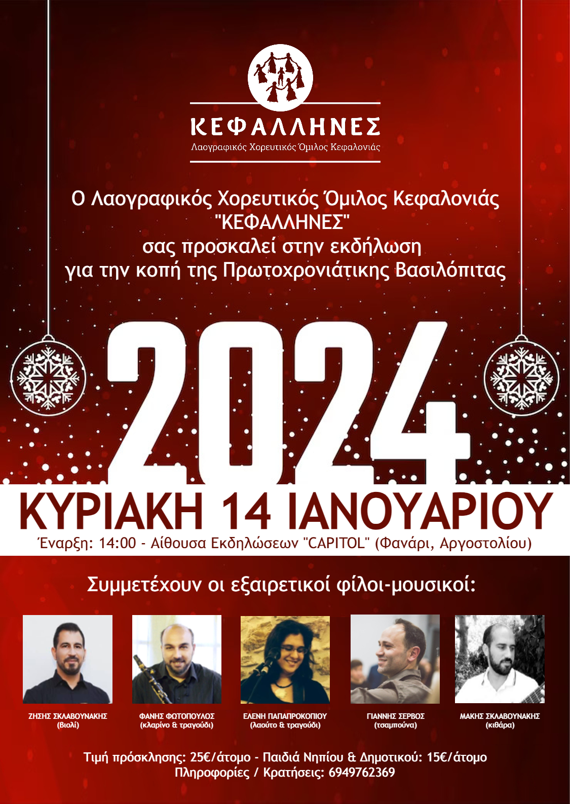 Ο Λαογραφικός Χορευτικός Όμιλος “ΚΕΦΑΛΛΗΝΕΣ”, σας προσκαλεί στην κοπή της Πρωτοχρονιάτικης Βασιλόπιτας του, που θα πραγματοποιηθεί την Κυριακή 14 Ιανουαρίου 2024 και ώρα 14:00 στο κέντρο εκδηλώσεων Capitol (Φανάρι).
