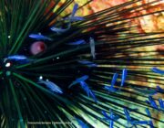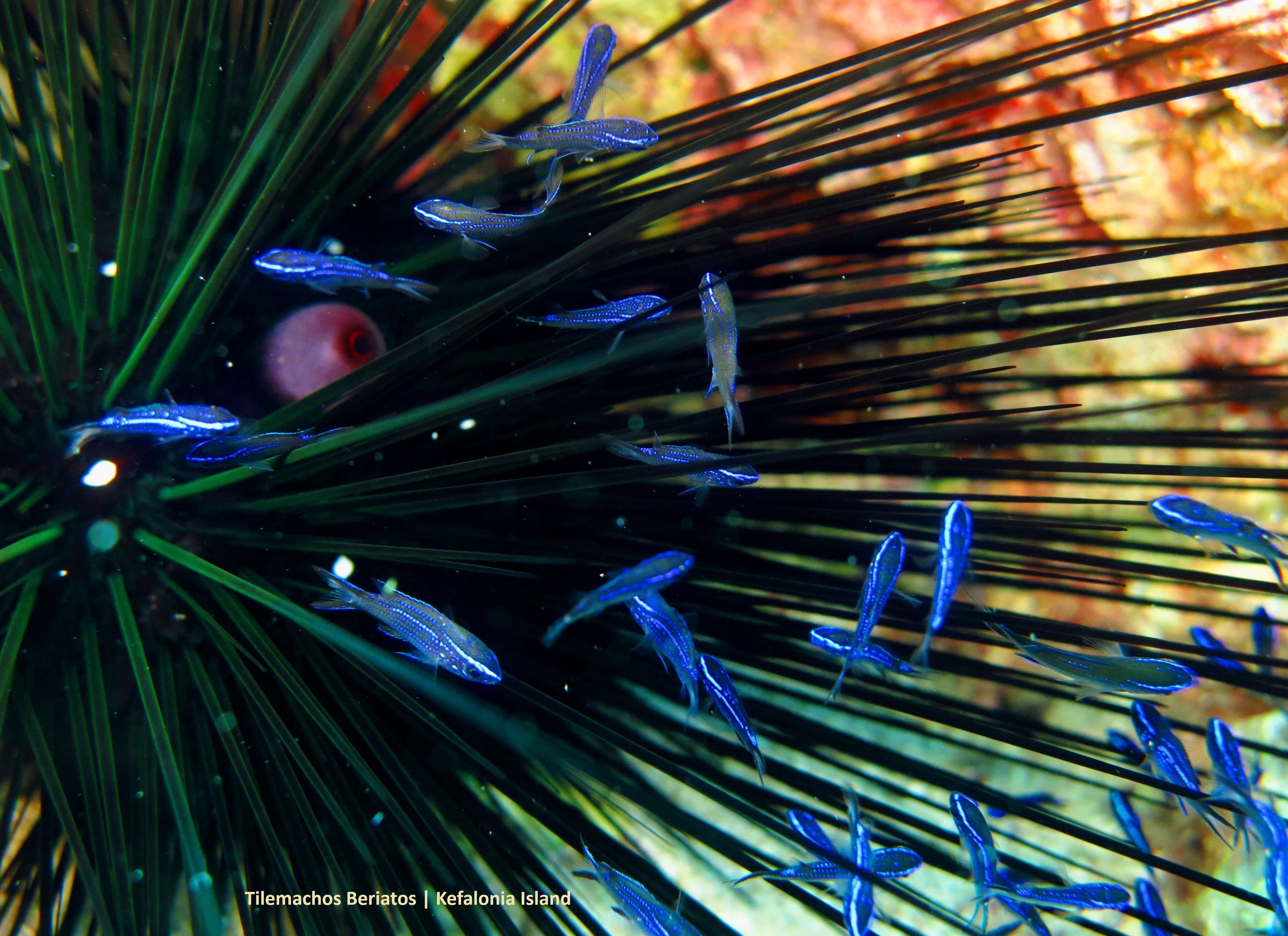 Τα όμορφα και ..πονηρά μικρά μπλε ψαράκια που βλέπουμε να έχουν βρει καταφύγιο ανάμεσα από τα αγκάθια του είναι ανήλικα άτομα από τις γνωστές μας «παπαδιές» ή «καλόγριες» (κοινή ονομασία στα αγγλικά: Damselfish, επιστημονική ονομασία: “Chromis chromis”) που μεγαλώνοντας παίρνουν το γνωστό μας μαύρο χρώμα με υπόλευκο στην κοιλιά. Φαίνεται ότι νιώθουν πιο ασφαλή ανάμεσα στα μεγάλα αγκάθια του αχινού, παρόλο που αυτός αποτελεί απειλή για άλλα είδη του οικοσυστήματος, πράγμα που επιβεβαιώνει ότι η προσαρμογή είναι πάντα μέρος της εξελικτικής διαδικασίας της ζωής.. έτσι είναι παράξενο και ειρωνικό, ένα είδος που είναι βλαβερό για ένα πλάσμα, να φαντάζει επωφελές για ένα άλλο.