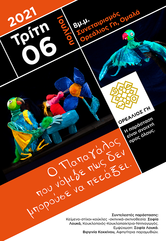 Μια δωρεάν παράσταση για τους μικρούς μας φίλους διοργανώνει ο Συνεταιρισμός Ρομπόλας «Ορεάλιος Γη» σε συνεργασία με τη Σοφία Λουκά, κουκλοποιό-κουκλοπαίκτρια-νηπιαγωγό από το Κουκλοθέατρο Ανέμη και τη Βιργινία Κοκκίνου, αφηγήτρια παραμυθιών