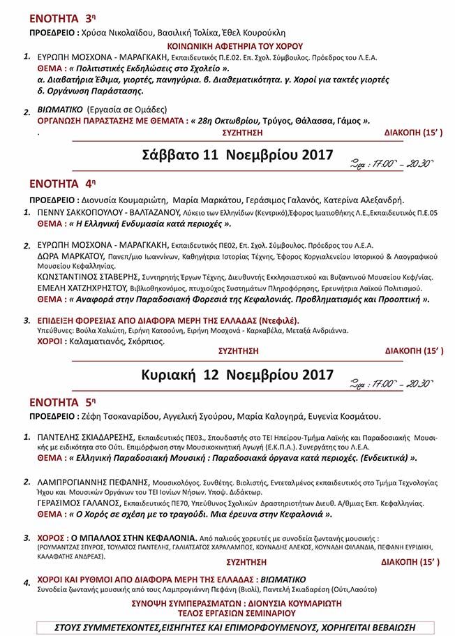 Όπως εξαρχής ανακοινώθηκε το σεμινάριο αυτό είναι το πρώτο μέρος μιας δράσης επιμορφωτικής, διάρκειας 50 ωρών. Θα ακολουθήσουν δυο σεμινάρια βιωματικού χαρακτήρα με διδασκαλία χορού από συγκεκριμένες περιοχές με ειδικούς δασκάλους που θα προσκληθούν για το σκοπό αυτό. Κάθε ενότητα θα έχει θεωρητικό και πρακτικό μέρος. Επιλογικά θα πραγματοποιηθεί εκδρομή σε Πελοπόννησο και Αθήνα με κύριο στόχο την επίσκεψη τόπων και μουσείων σχετικών με το θέμα και συμμετοχή σε δράσεις Παραρτημάτων του Λυκείου των Ελληνίδων.