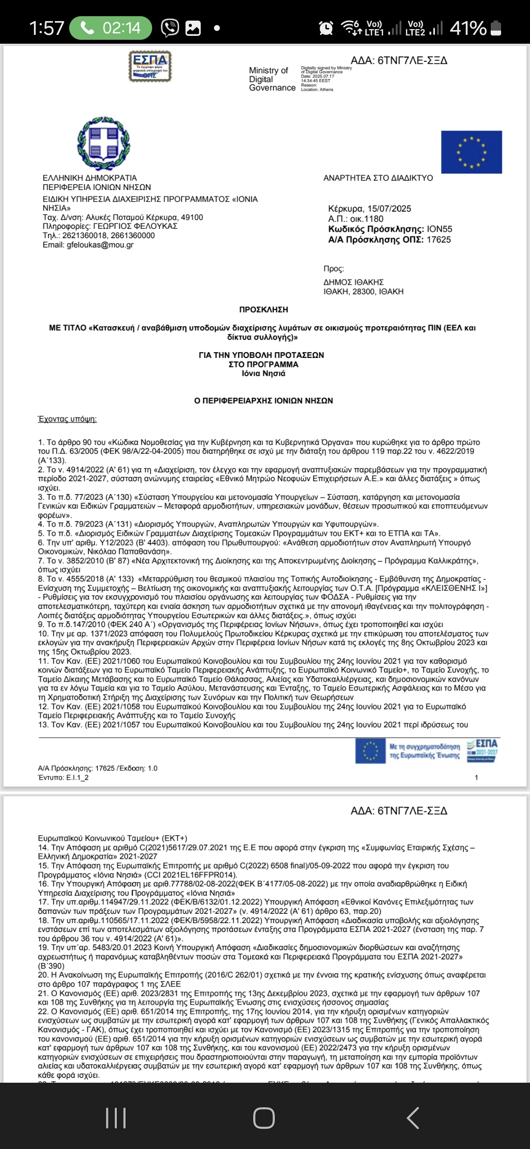 – Ο Περιφερειάρχης καλεί τους παρακάτω δυνητικούς δικαιούχους: ΔΗΜΟΣ ΙΘΑΚΗΣ ΝΟΜΟΥ ΚΕΦΑΛΛΗΝΙΑΣ