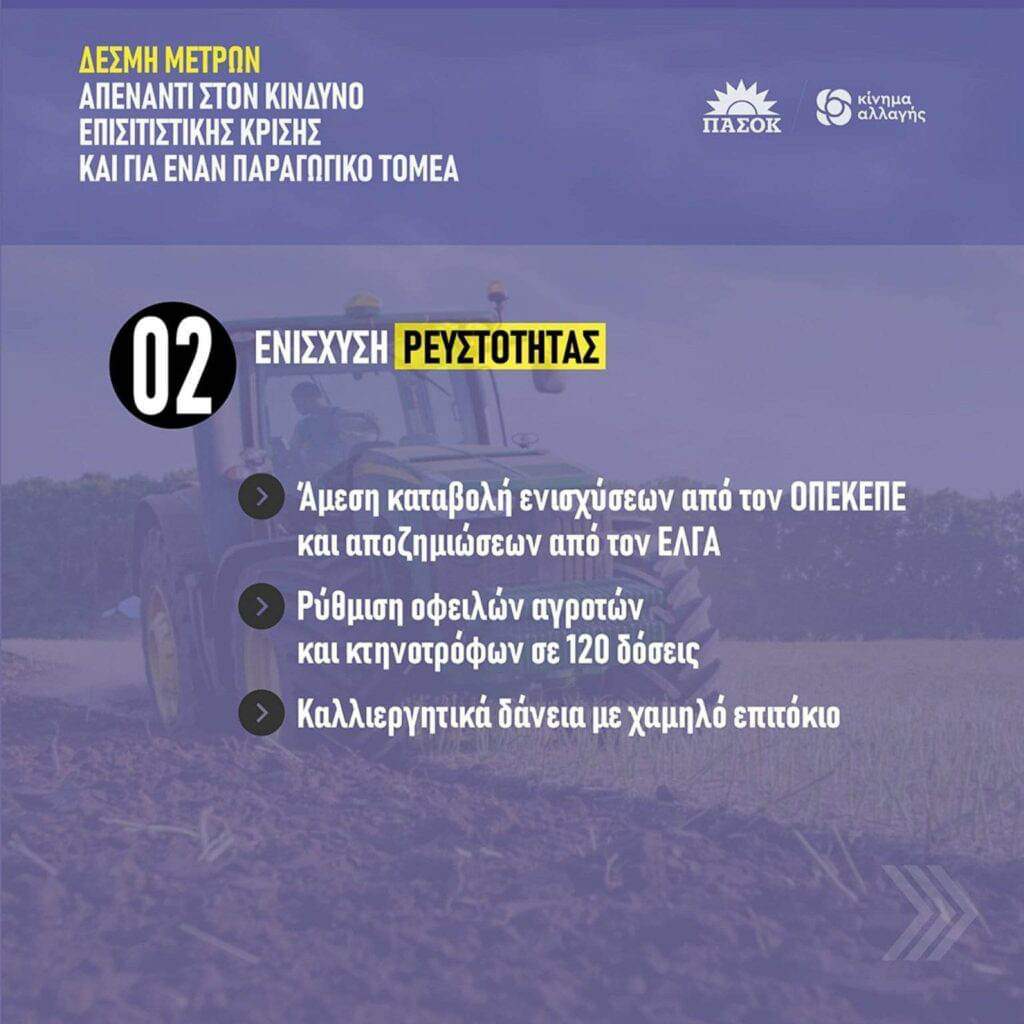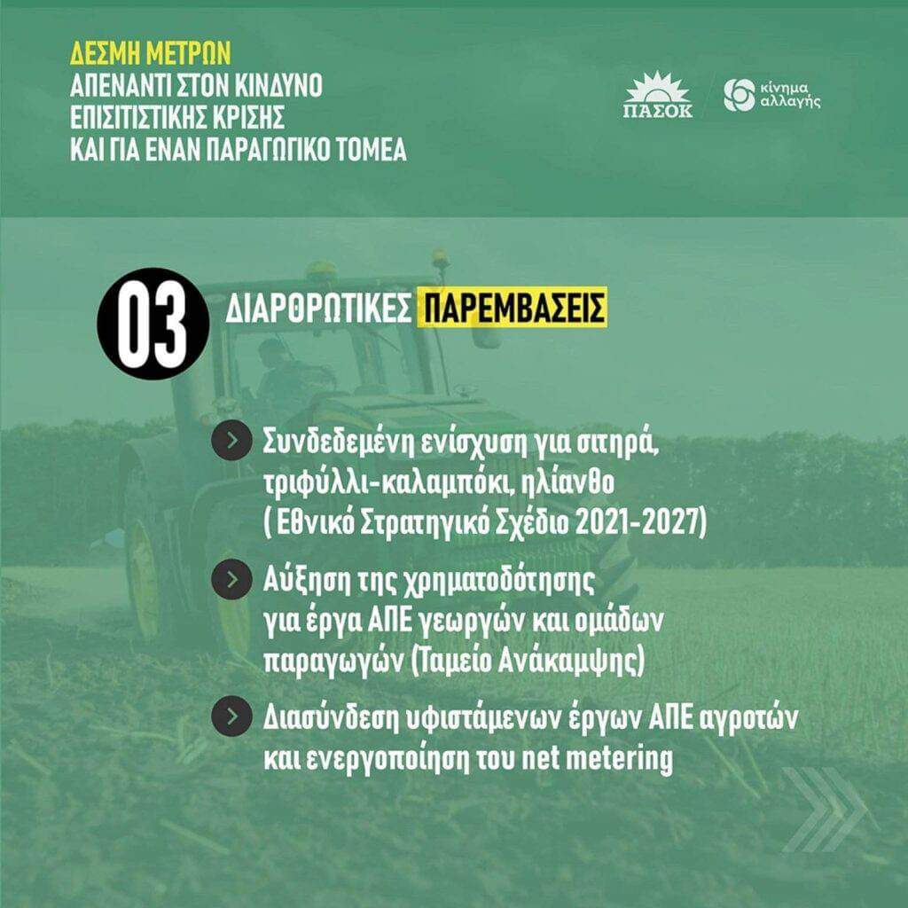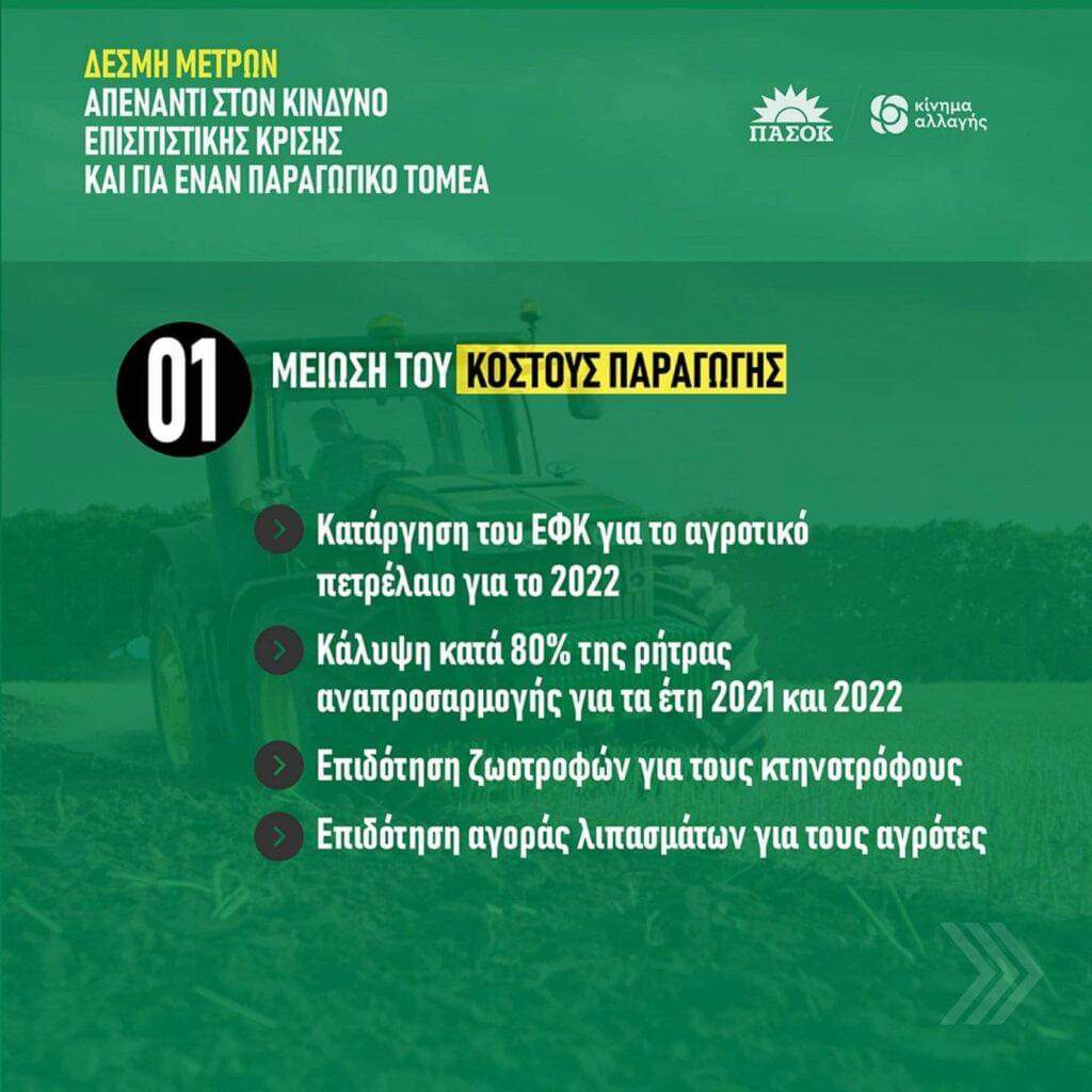 Η θωράκιση του αγροδιατροφικού τομέα αποτελεί προτεραιότητα για το ΠΑ.ΣΟ.Κ. Ήδη η Παράταξή μας έχει καταθέσει δέσμη προτάσεων για την άμβλυνση των προβλημάτων που έχει συσσωρεύσει στον αγροτικό κόσμο το ράλι στις τιμές ενέργειας. Μεταξύ άλλων, έχει προταθεί η επιβολή πλαφόν στη λιανική τιμή του ρεύματος, η κάλυψη του κόστους των εφοδίων και ζωοτροφών για το μέρος που οφείλεται στην ακριβή ενέργεια, η επιστροφή του ΕΦΚ των καυσίμων με βάση την κατανάλωση κάθε εκμετάλλευσης.