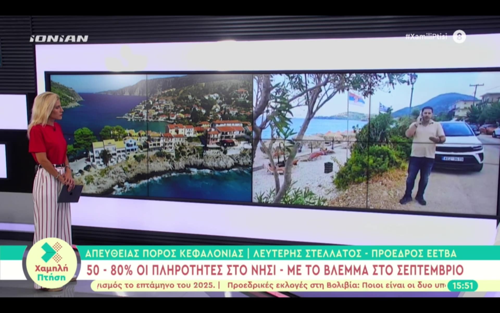 Σημαντική και μεγάλη σε χρονική διάρκεια (σχεδόν 9 λεπτά) υπήρξε η συνέντευξη του δραστήριου Προέδρου του εμπορικού και επαγγελματικού συλλόγου Ε.Ε.Τ.Β.Α. “Άτρος” Λευτέρη Στελλάτου στην έγκριτη τηλεοπτική εκπομπή “Χαμηλή Πτήση” της Αγγελικής Σπυροπούλου στο Ionian TV το μεσημέρι της Δευτέρας με φόντο την πανέμορφη και βραβευμένη με “Γαλάζια Σημαία” Παραλία Αράγια του Πόρου της Κεφαλονιάς μας!