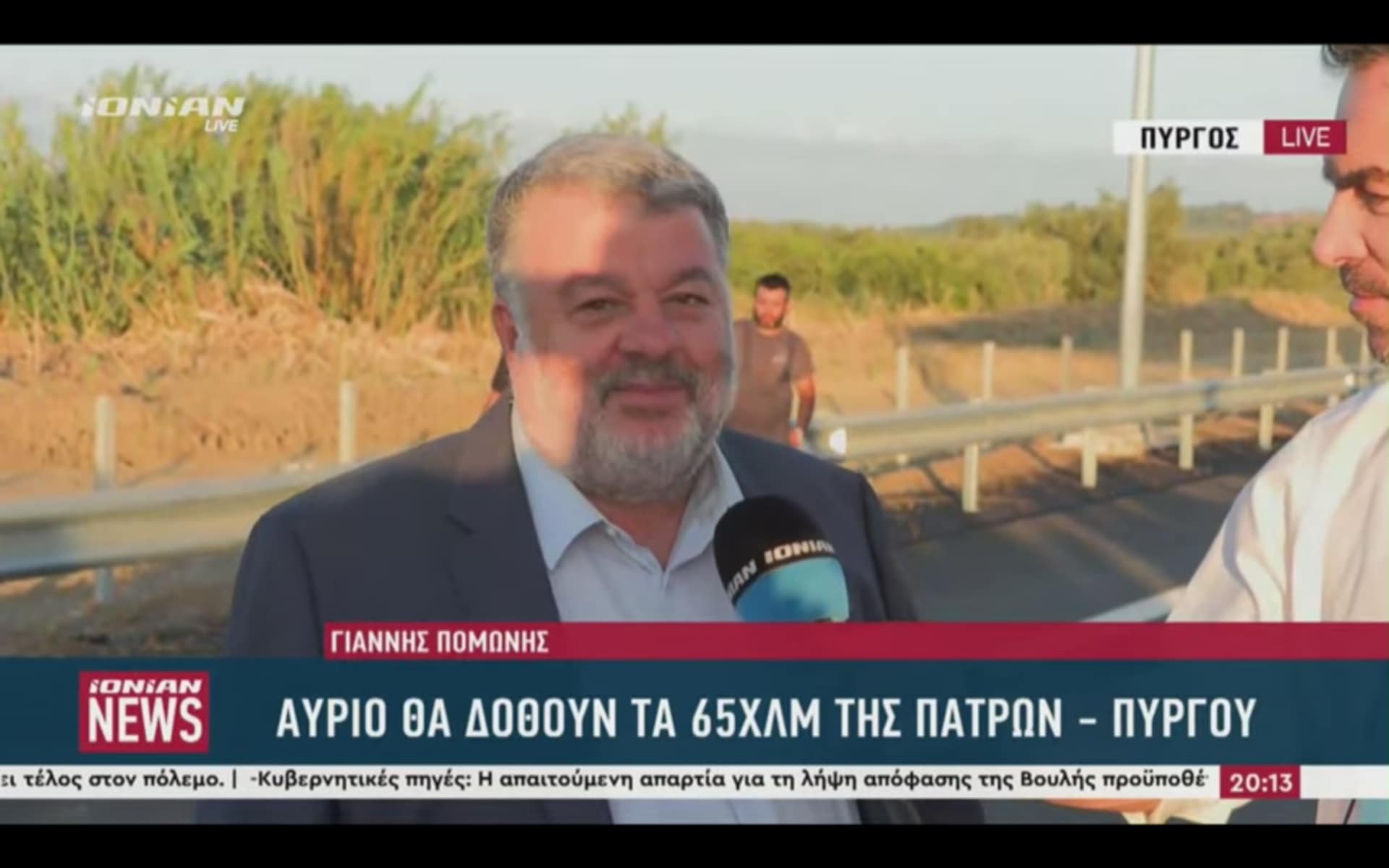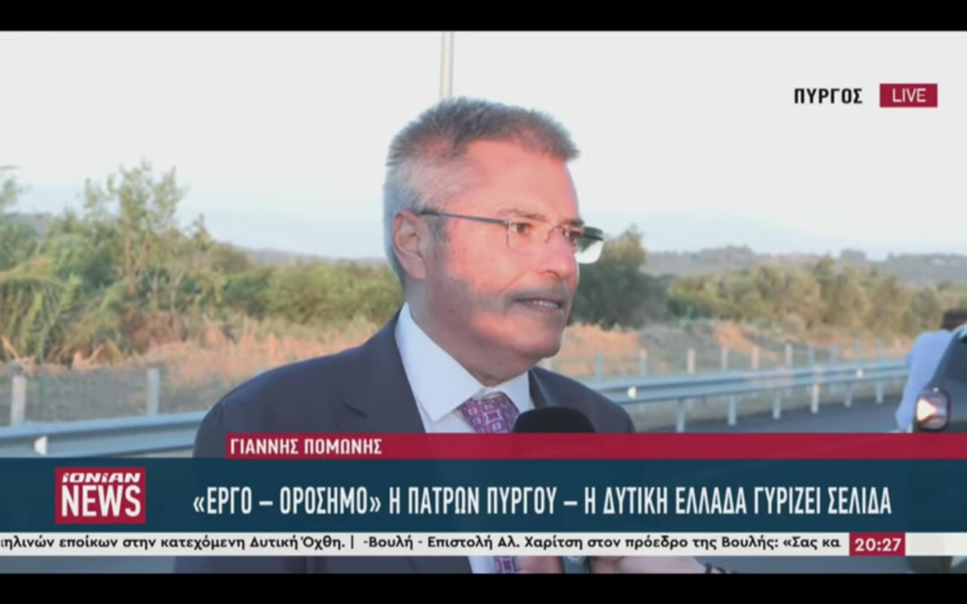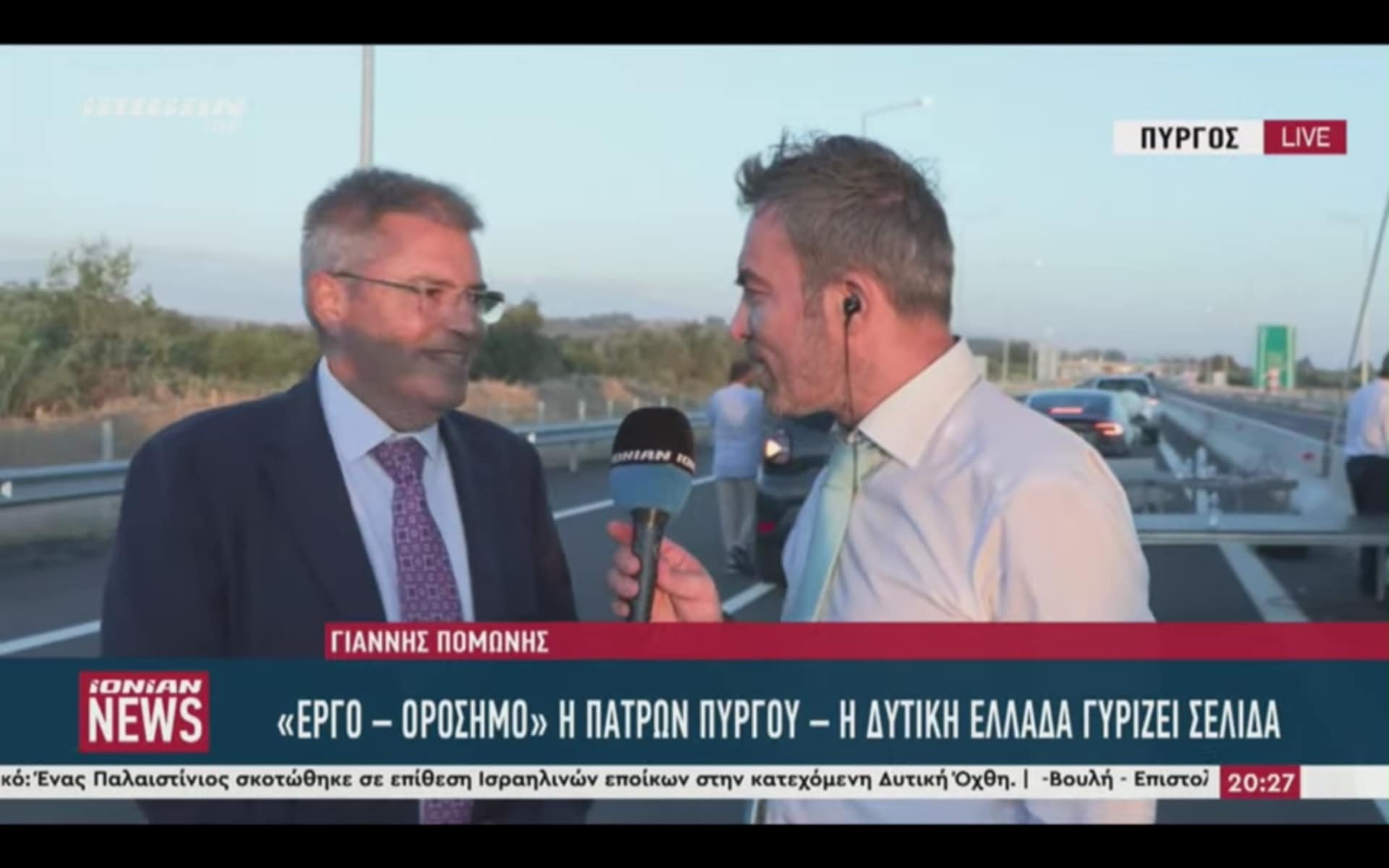 Τη μεγάλη τους χαρά ζωντανά στη κάμερα του Ionian TV εξέφρασαν το απόγευμα της Πέμπτης 31 Ιουλίου 2025, μετά την ιστορική ομιλία του Πρωθυπουργού Κυριάκου Μητσοτάκη για τα εγκαίνια του νέου σύγχρονου Εθνικού Άξονα Πατρών-Πύργου, ο Δήμαρχος Αργοστολίου Θεόφιλος Μιχαλάτος, ο Βουλευτής Κεφαλονιάς και Ιθάκης Παναγής Καππάτος και ο Υπουργός Υποδομών και Δικτύων Χρίστος Δήμας!
