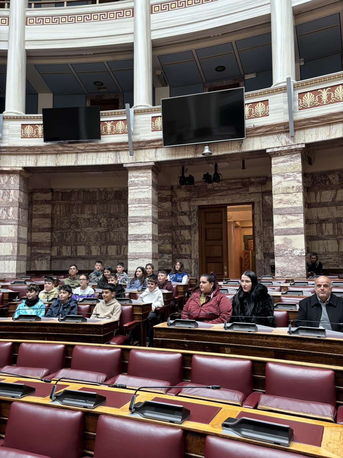 Οι μικροί μας επισκέπτες είχαν την ευκαιρία να καθίσουν στα έδρανα των Βουλευτών στην Αίθουσα της Ολομέλειας, βιώνοντας, έστω και για λίγο, τη σημασία της εκπροσώπησης και της κοινοβουλευτικής διαδικασίας.