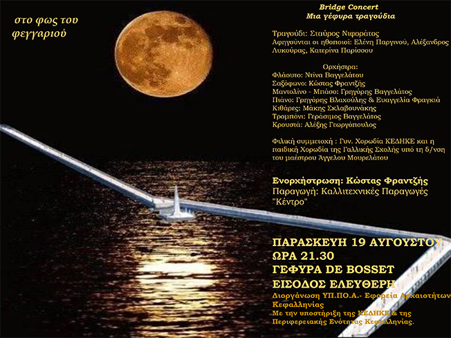 Η Εφορεία Αρχαιοτήτων Κεφαλληνίας συμμετέχοντας και φέτος στο θεσμό εορτασμού της Πανσελήνου του Αυγούστου, που καθιερώθηκε από τη Γενική Διεύθυνση Αρχαιοτήτων & Πολιτιστικής Κληρονομιάς του Υπουργείου Πολιτισμού & Αθλητισμού, σας προσκαλεί στη μουσική εκδήλωση “Μια Γέφυρα τραγούδια”, που θα πραγματοποιηθεί την Παρασκευή 19-08-2016 στη Γέφυρα De Bosset.
