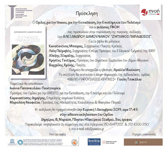 Η Αδελφότητα Κεφαλλήνων και Ιθακησίων Πειραιά σας προσκαλεί με χαρά στην παρουσίαση της ποιητικής συλλογής του συμπατριώτη μας Αλέξανδρου Δαμουλιάνου «Ζητιάνος Παράδεισος» που διοργανώνουν ο Όμιλος Unesco για την Εκπαίδευση, την Επιστήμη και τον Πολιτισμό και οι Εκδόσεις Πνοή, την Κυριακή 1 Δεκεμβρίου 2019 και ώρα 17:45 στην αίθουσα εκδηλώσεων του Ομίλου Unesco για την Εκπαίδευση, την Επιστήμη και τον Πολιτισμό, Δήμητρος 8, Μαρούσι 3ος όροφος (πλησίον Ηλεκτρικού Σταθμού).
